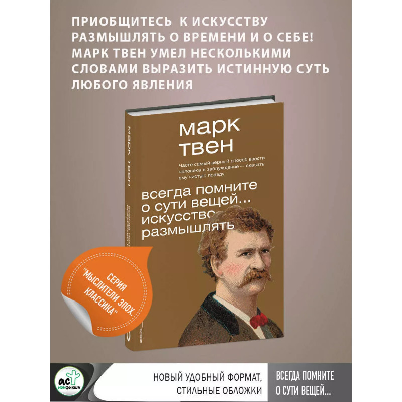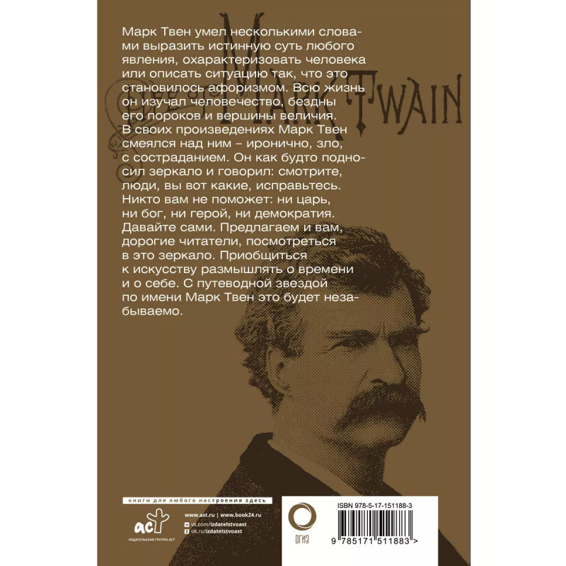 Всегда помните о сути вещей... Искусство размышлять. Марк Твен умел несколькими словами выразить истинную суть любого явления, охарактеризовать человека или описать ситуацию так, что это становилось афоризмом. Всю жизнь он изучал человечество, бездны его пороков и вершины величия. В своих произведениях Марк Твен смеялся над ним - иронично, зло, с состраданием. Он как будто подносил зеркало и говорил: смотрите, люди, вы вот какие, исправьтесь. Никто вам не поможет: ни царь, ни бог, ни герой, ни демократия. Давайте сами. Предлагаем и вам, дорогие читатели, посмотреться в это зеркало. Приобщиться к искусству размышлять о времени и о себе. С путеводной звездой по имени Марк Твен это будет незабываемо.