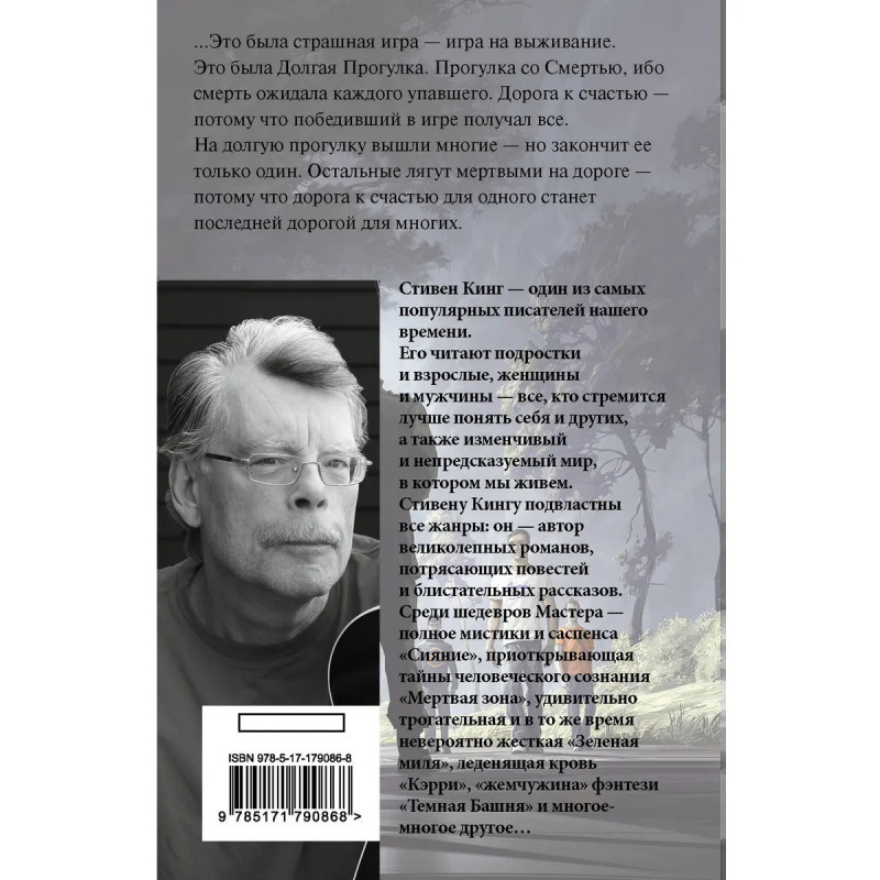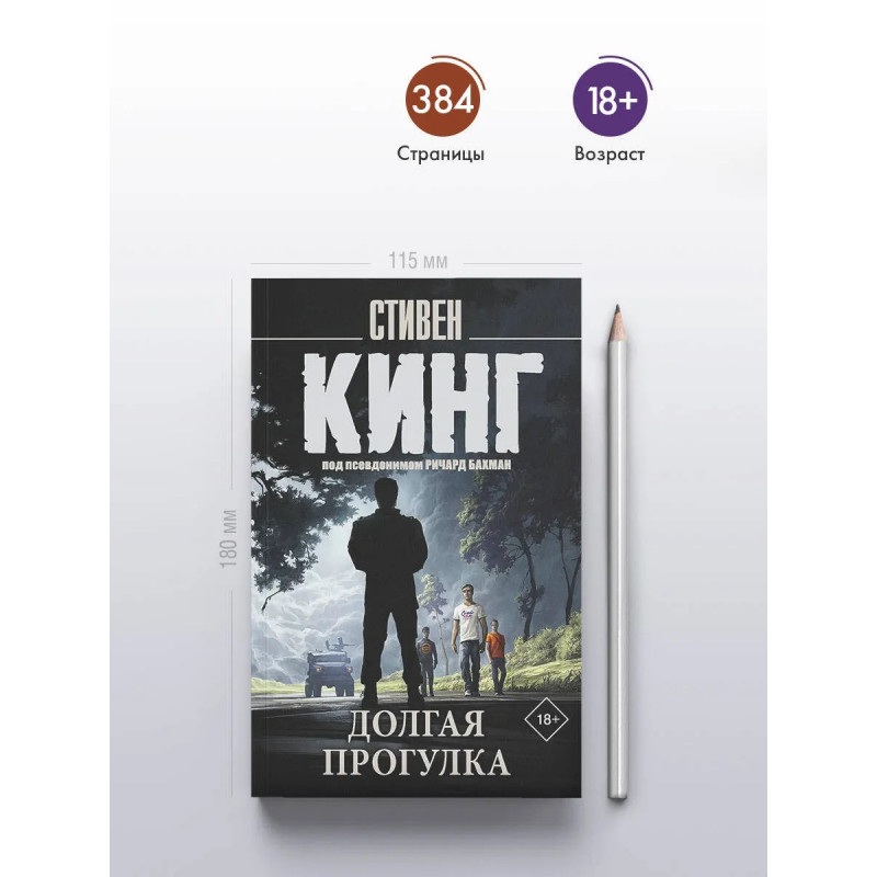 — От автора романов «Зеленая миля», «Сияние» и «Оно». — Стивен Кинг — один из самых популярных писателей современности. Он создал свыше семи десятков бестселлеров, которые переведены на 44 языка, изданы в 80 странах мира и разошлись по свету тиражом свыше 400 000 000 экземпляров. — «Долгая Прогулка» — самый первый роман Стивена Кинга, написанный еще в 1967-68 годах. Кинг более десяти лет пытался ее опубликовать, но в итоге роман вышел лишь в 1979 году — под псевдонимом «Ричард Бахман». — Сам Стивен Кинг считает «Долгую прогулку» лучшим из своих ранних произведений. — В данном издании роман публикуется в новом переводе Екатерины Романовой. — Издание в удобном карманном формате. — Читайте книгу — смотрите фильм. В сентябре 2025 года в кино выходит экранизация романа, режиссером которой выступил Фрэнсис Лоуренс («Сойка-пересмешница», «И вспыхнет пламя»), а главные роли сыграли Купер Хоффман («Лакричная пицца») и Марк Хэмилл («Звездные войны»).