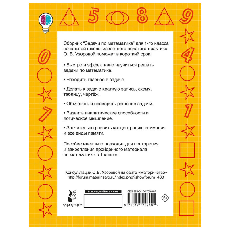 Высокоэффективный учебный тренинг известного педагога-практика О. В. Узоровой «Задачи по математике. 1-й класс» базируется на современных методиках. Он поспособствует активации мыслительных процессов ребёнка за короткий срок. Книга содержит не только арифметический тренажёр, но и задания на полях, которые помогут юному ученику не только не терять интерес к решению примеров, но и увлечь его этим занятием. Благодаря критериям оценки под каждым заданием ребёнок получит мотивацию научиться быстро применять вычислительные навыки. Тренажёр поможет: - запоминать цифры и числа, - научиться быстро решать примеры, уравнения и задачи разных типов, - значительно развить концентрацию внимания и все виды памяти, - улучшить обучаемость и усвоение любого материала.