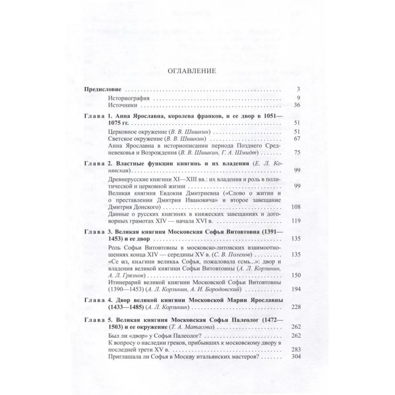Книга посвящена изучению окружения русских княгинь, их роли в системе властных структур России и государств Европы в Средневековье и раннее Новое время. Исследование охватывает широкий хронологический период от княжения Ярослава Мудрого до правления вдовы Василия III великой княгини Елены Глинской. Рассмотрены дворы дочери Ярослава Мудрого и королевы Франции Анны Ярославны, жены Дмитрия Донского Евдокии Дмитриевны, жены Василия I Софьи Витовтовны, жены Василия II Марии Ярославны, второй жены Ивана III Софьи Палеолог, дочери Ивана III и великой княгини Литовской Елены Ивановны, второй жены Василия III Елены Глинской и некоторых других княгинь. В Приложениях помещены уникальные источники, раскрывающие различные аспекты жизни и придворной деятельности русских княгинь. Книга адресована исследователям русского и западноевропейского Средневековья, преподавателям, студентам, а также всем, кто интересуется средневековой историей России.