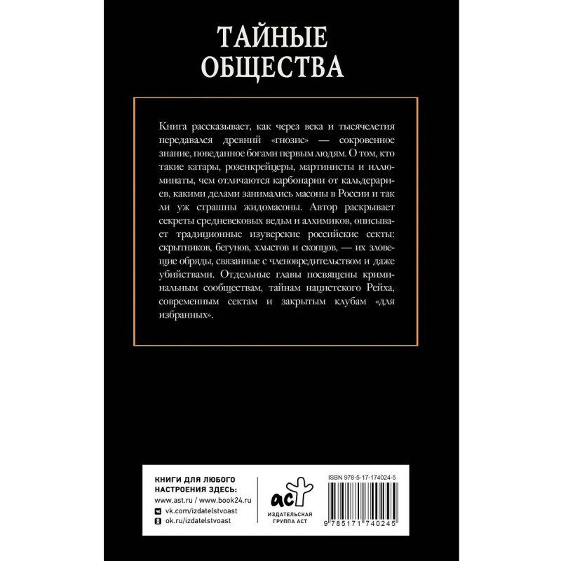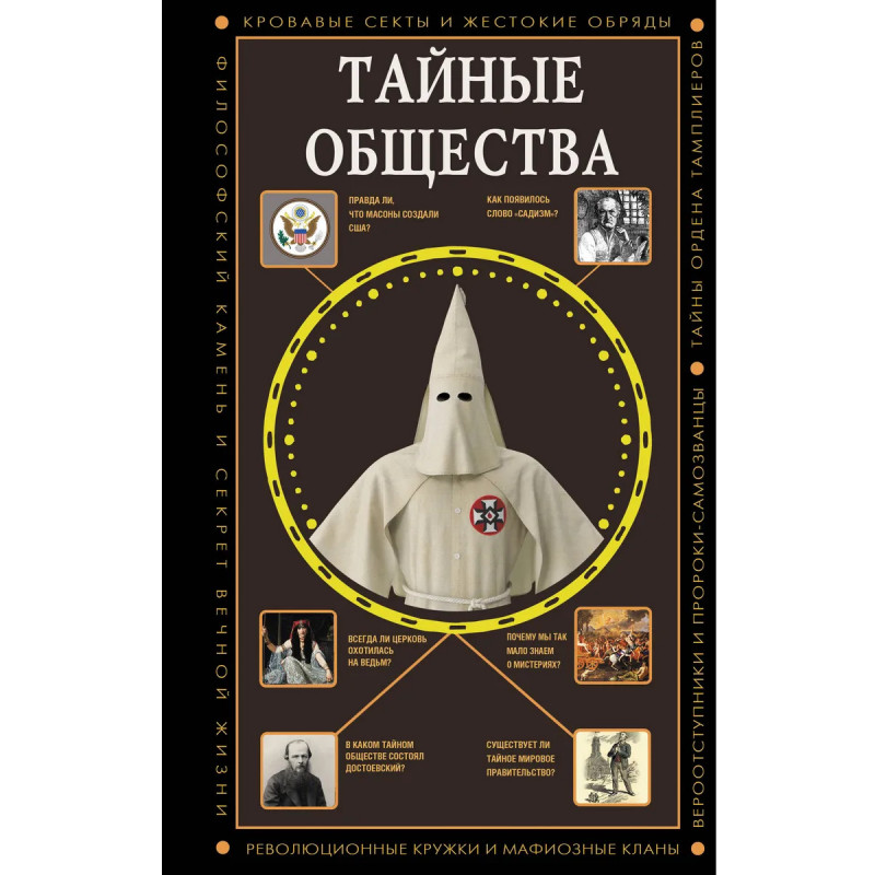 Книга рассказывает, как через века и тысячелетия передавался древний "гнозис" — сокровенное знание, поведанное богами первым людям. О том, кто такие катары, розенкрейцеры, мартинисты и иллюминаты; чем отличаются карбонарии от кальдерариев; какими делами занимались масоны в России и так ли уж страшны жидомасоны. Автор раскрывает секреты средневековых ведьм и алхимиков, описывает традиционные изуверские российские секты: скрытников, бегунов, хлыстов и скопцов; их зловещие обряды, связанные с членовредительством и даже убийствами. Отдельные главы посвящены криминальным сообществам, тайнам нацистского Рейха, современным сектам и закрытым клубам "для избранных".