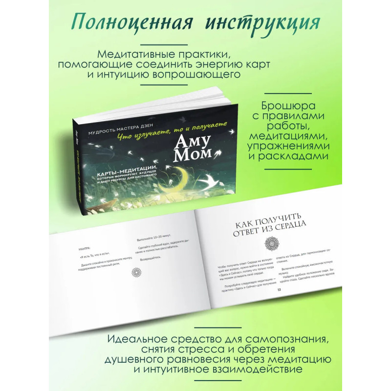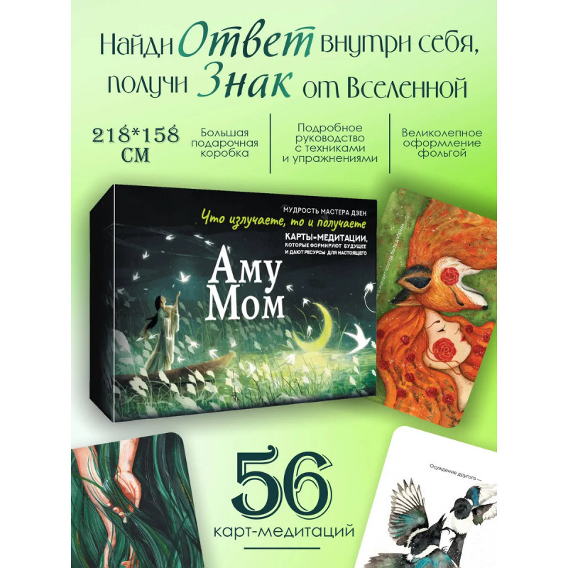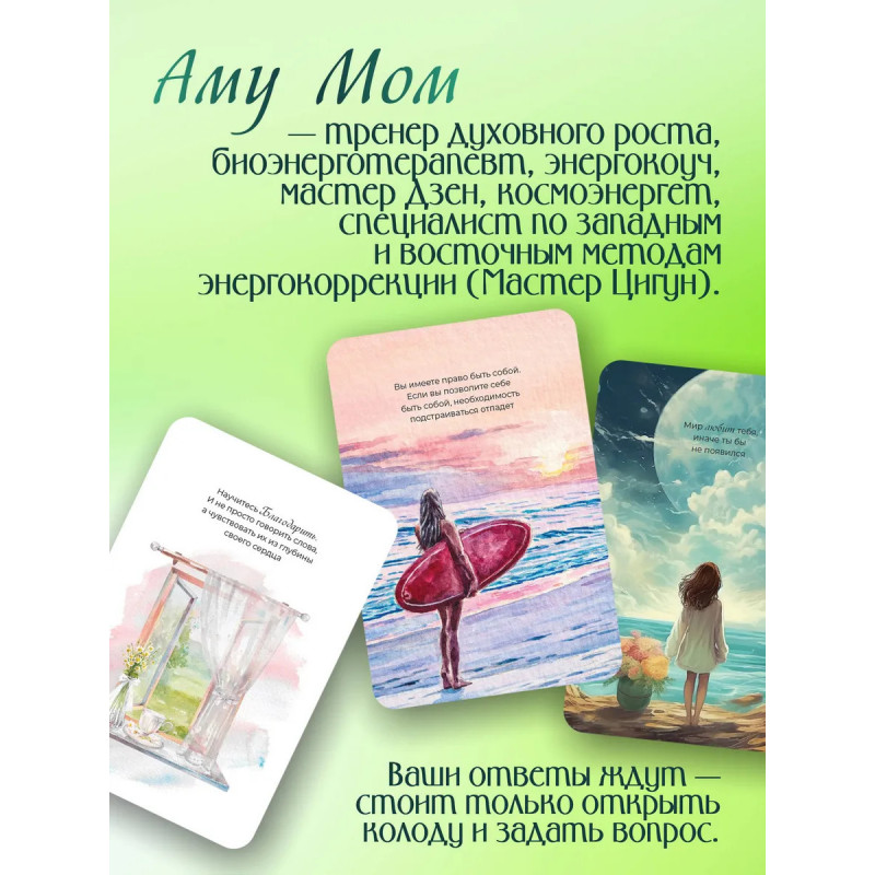Аму Мом — тренер духовного роста, биоэнерготерапевт, энергокоуч, мастер Дзен. Погрузитесь в таинственный диалог со Вселенной через уникальные карты, созданные для работы с подсознанием. Этот набор, дополненный руководством от Мастера Дзен, станет вашим ключом к гармонии, ясности и внутреннему покою. Учитесь считывать знаки и символы, расшифровывать сообщения, которые будут вам посланы. Превратите тревоги в осознанность, а вопросы — в озарения. Каждая карта — это медитация, мост между вашим глубинным "Я" и космической мудростью, инструмент для снятия стресса и пробуждения интуиции. Идеально для тех, кто ищет ответы, стремится к самопознанию и хочет обрести опору в потоке жизни. Перезагрузите свою реальность и начните получать послания от всезнающей Вселенной. Внутри 56 ценных карт-знаков и подробное руководство по работе с медитациями.