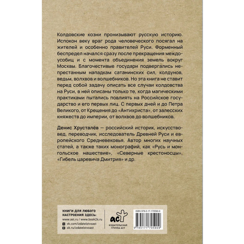 Колдовские козни пронизывают русскую историю. Испокон веку враг рода человеческого посягал на жителей и особенно правителей Руси. Форменный беспредел начался сразу после прекращения междоусобиц и с момента объединения земель вокруг Москвы. Благочестивые государи подвергались непрестанным нападкам сатанинских сил, колдунов, ведьм, волхвов и волшебников. Но эта книга не ставит перед собой задачу описать все случаи колдовства на Руси, в ней описаны только те, когда магическими практиками пытались повлиять на Российское государство и его первых лиц. С первых дней и до Петра Великого, от Крещения до "Антихриста", от залесских княжеств до империи, от волхвов до волшебников. Денис Хрусталёв – российский историк, искусствовед, переводчик, исследователь Древней Руси и европейского Средневековья. Автор многих научных статей, а также таких монографий, как "Русь и монгольское нашествие", "Северные крестоносцы", "Гибель царевича Дмитрия"" и др.
