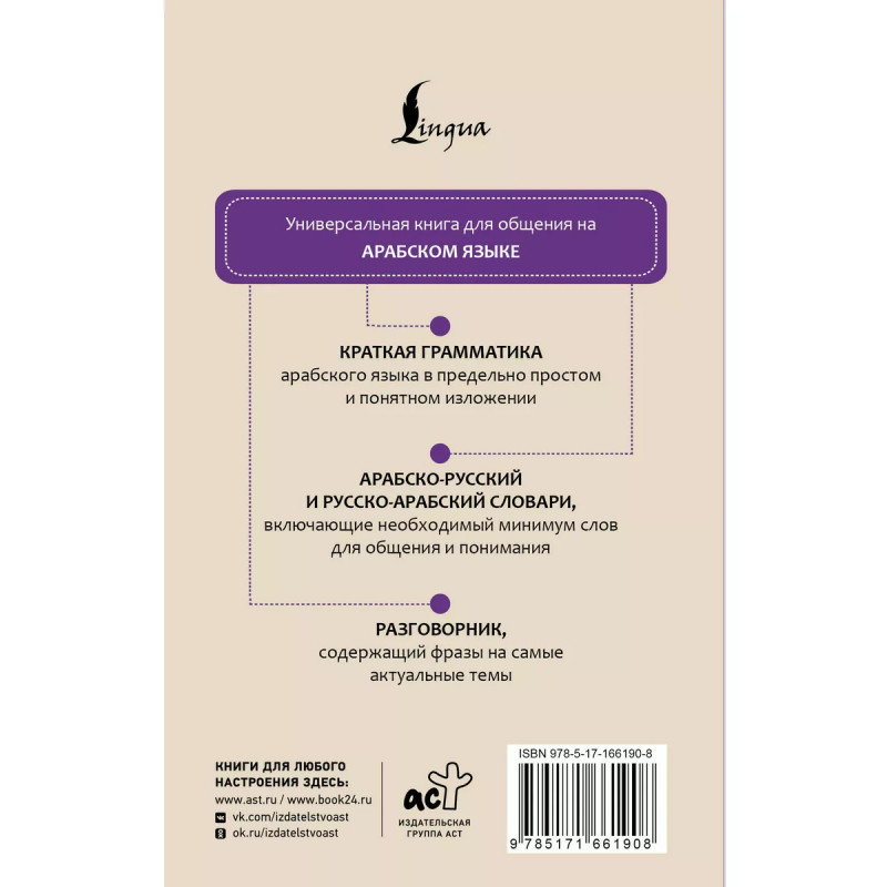Книга представляет собой современный тип самоучителя и состоит из 4 частей, содержащих самые нужные материалы для обучения иностранному языку: разговорник, арабско-русский и русско-арабский словари, а также раздел со сведениями по грамматике арабского языка в предельно простом и понятном изложении. Самоучитель будет полезен всем, кто интересуется арабским языком или начинает его изучать. С его помощью вы сможете овладеть языком до уровня A2.