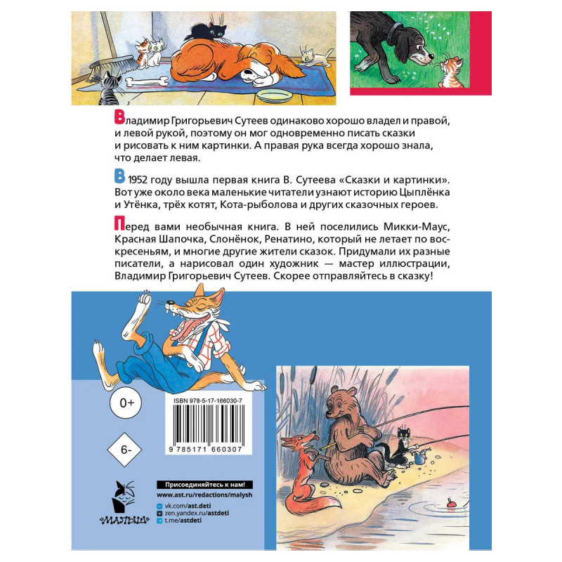 Владимир Григорьевич Сутеев одинаково хорошо владел и правой и левой рукой, поэтому он мог одновременно писать сказки и рисовать к ним картинки. А правая рука всегда хорошо знала, что делает левая. В 1952 году вышла первая книга В. Сутеева Сказки и картинки. Вот уже около века маленькие читатели узнают историю Цыплёнка и Утёнка, трёх котят, Кота рыболова и других сказочных героев. Перед вами необычная книга. В ней живут Микки-Маус, Красная Шапочка, Слонёнок, Ренатино, который не летает по воскресеньям, и многие другие жители сказок. Придумали их разные писатели, а нарисовал один художник мастер иллюстрации, Владимир Григорьевич Сутеев. Скорее отправляйтесь в сказку!