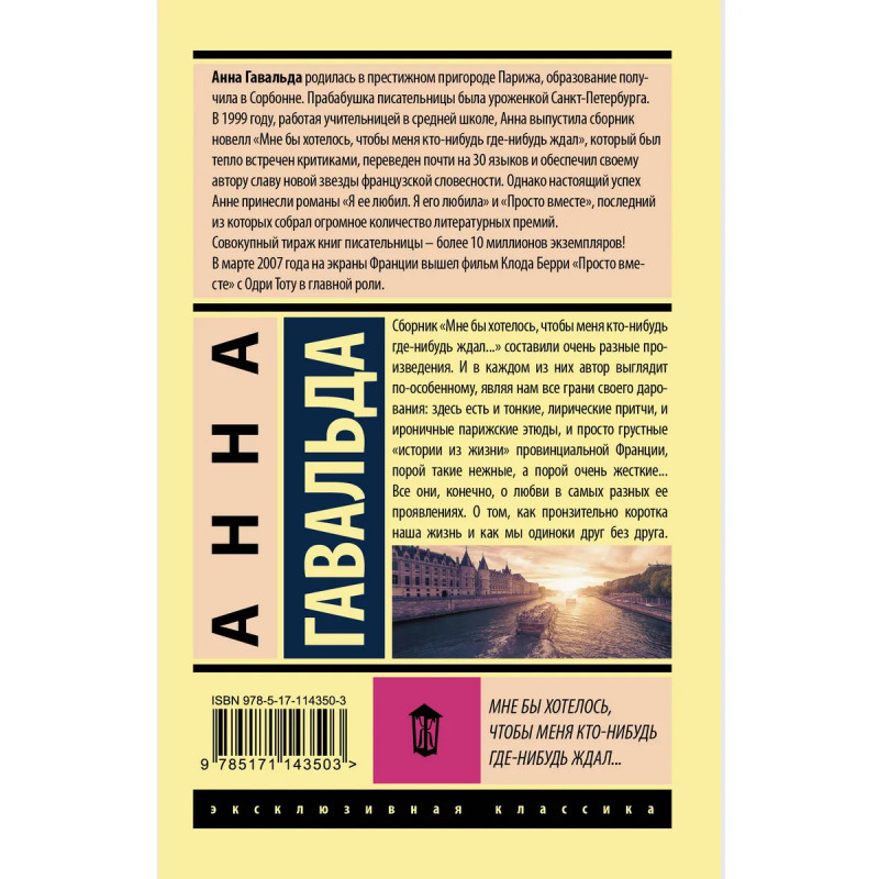 Анна Гавальда, известная французская писательница, покорившая мир своими романами и их изысканным, поэтическим стилем, начинала как автор новелл. Сборник "Мне бы хотелось, чтобы меня кто-нибудь где-нибудь ждал" составили очень разные произведения. И в каждом из них автор выглядит по-особенному, являя нам все грани своего дарования: здесь есть и тонкие лирические притчи, и ироничные парижские этюды, и просто грустные "истории из жизни" провинциальной Франции, порой такие нежные, а порой очень жесткие... Все они, конечно, о любви в самых разных ее проявлениях. О том, как пронзительно коротка наша жизнь и как мы одиноки друг без друга.
