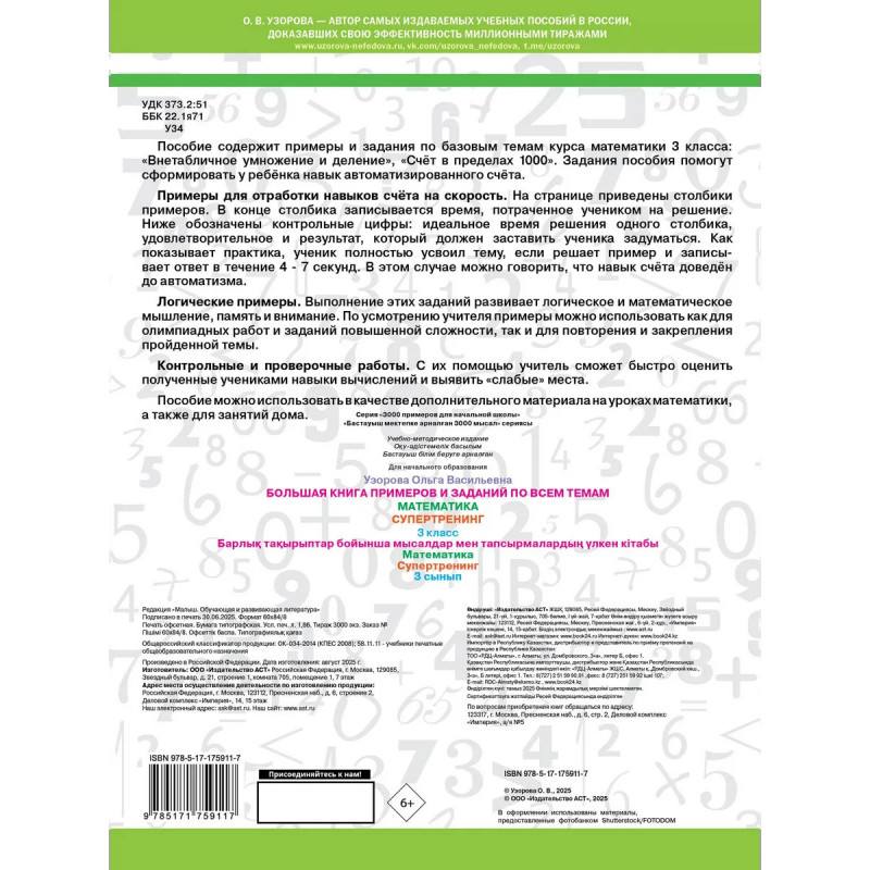 Пособие содержит примеры и задания по базовым темам курса математики 3 класса: «Внетабличное умножение и деление», «Счёт в пределах 1000», «Сложение и вычитание в столбик». В книгу вошли примеры для отработки навыков счёта на скорость; логические примеры, выполнение которых развивает логическое и математическое мышление, память и внимание; контрольные и проверочные работы. Задания пособия помогут сформировать у ребёнка навык автоматизированного счёта.