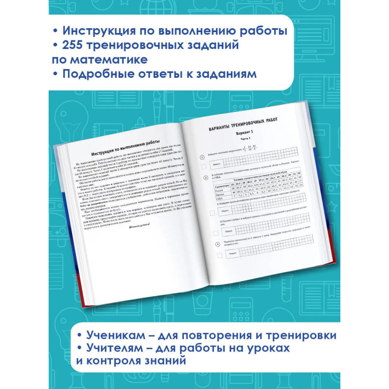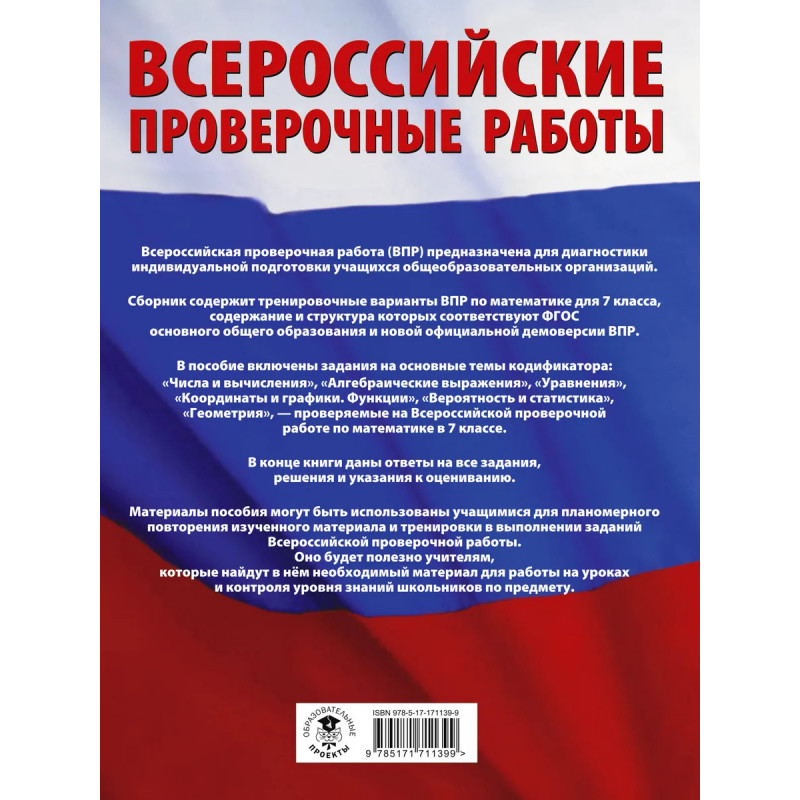 Данное пособие предназначено для учащихся 7-х классов общеобразовательных организаций. Оно позволяет в кратчайшие сроки проверить свои знания, потренироваться в выполнении заданий и тем самым успешно подготовиться к выполнению Всероссийской проверочной работы по математике по итогам обучения в 7-м классе. Пособие содержит 15 тренировочных вариантов проверочных работ. Содержание проверочной работы соответствует Федеральному государственному образовательному стандарту основного общего образования. Каждый вариант составлен в полном соответствии с демонстрационным вариантом, представленном на информационном портале по Всероссийским проверочным работам. В конце книги даны ответы на все задания, решения и критерии оценивания. Материалы пособия будут полезны учителям, которые найдут в нём материал для работы на уроках и контроля уровня знаний школьников по предмету.