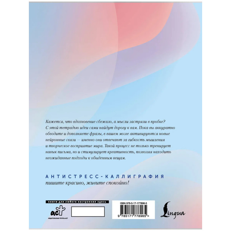 Чувствуете, что творческое мышление зашло в тупик, а вдохновение словно заблокировано? Эта тетрадь — ваш верный спутник на пути к новым идеям и нестандартным решениям. Пока вы аккуратно обводите и дополняете фразы, в вашем мозге активируются новые нейронные связи — именно они отвечают за гибкость мышления и творческое восприятие мира. Такой процесс не только тренирует навык письма, но и стимулирует креативность, позволяя находить неожиданные подходы к обыденным вещам. Это не просто каллиграфия, а увлекательная тренировка ума, которая поможет раскрыть потенциал и наполнить жизнь новыми красками. "Взрослые прописи для вдохновения" — для тех, кто хочет не просто писать красиво, но и жить ярко.