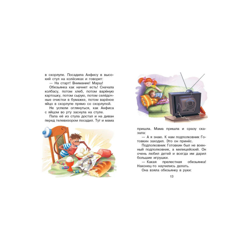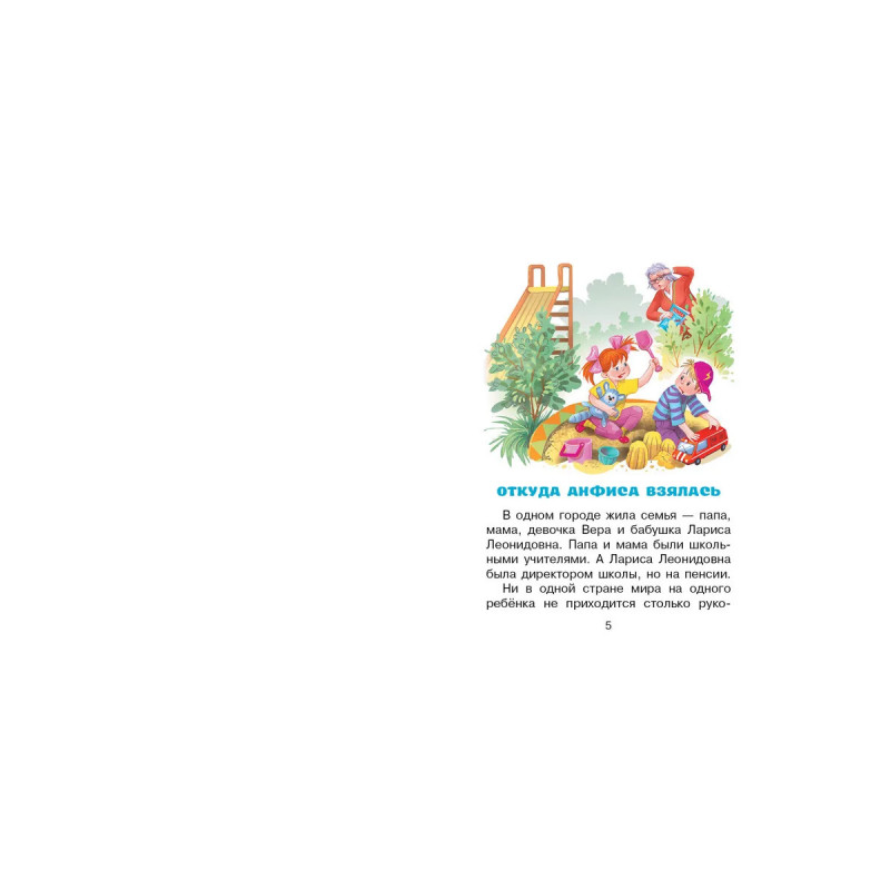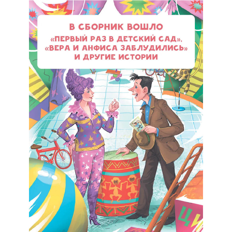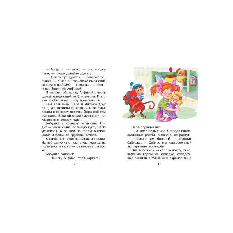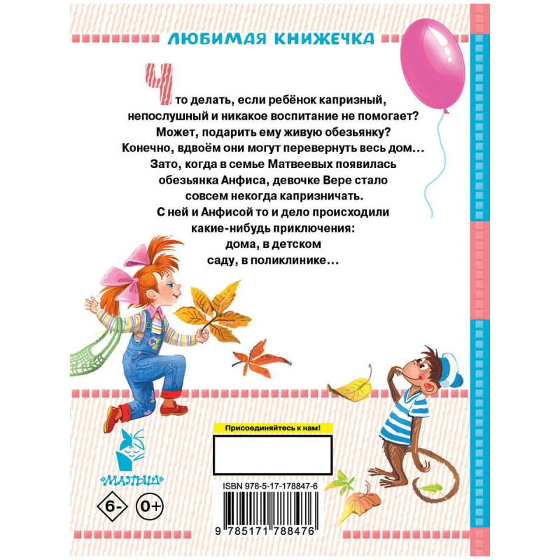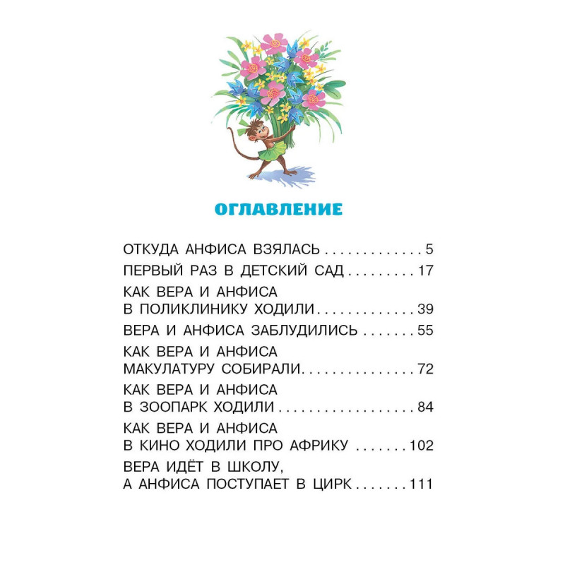 Однажды в самой обычной квартире, где жили папа, мама, бабушка и капризная девочка Вера, по- явилась обезьянка Анфиса. И Вере стало некогда капризничать, ведь её новая подружка всё время требовала внимания. Какие только приключения не случались с обезьянкой в детском саду, поликли- нике, булочной, школе... Весёлые истории Эдуарда Успенского про девочку Веру и обезьянку Анфису не оставят равнодушными ни ребят, ни их родителей. Для детей до 3-х лет.