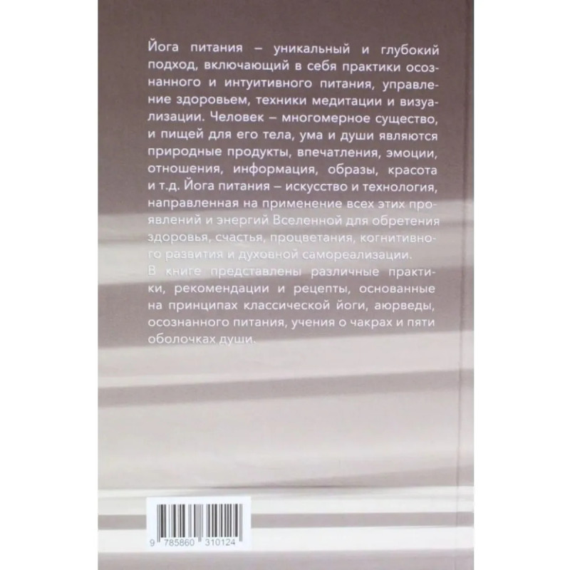 Йога питания — уникальный и глубокий подход, включающий в себя практики осознанного и интуитив ного питания, управление здоровьем, техники медита ции и визуализации. Человек — многомерное существо, и пищей для его тела, ума и души являются природные продукты, впечатления, эмоции, отношения, информа- ция, образы, красота и т.д. Йога питания — искусство и технология, направленная на применение всех этих проявлений и энергий Вселенной для обретения здоро вья, счастья, процветания, когнитивного развития и ду ховной самореализации.В книге представлены различные практики, рекомендации и рецепты, основанные на принципах классической йоги, аюрведы, осознанного питания, учения о чак рах и пяти оболочках души.