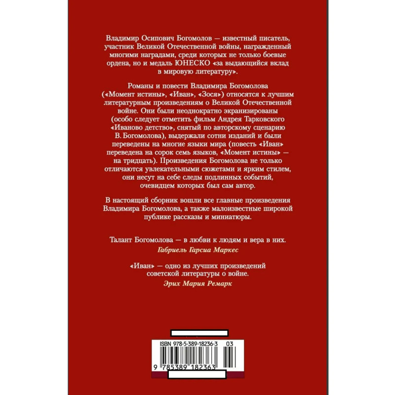 Владимир Осипович Богомолов — известный писатель, участник Великой Отечественной войны, награжденный многими наградами, среди которых не только боевые ордена, но и медаль ЮНЕСКО «за выдающийся вклад в мировую литературу». Романы и повести Владимира Богомолова («Момент истины», «Иван», «Зося») относятся к лучшим литературным произведениям о Великой Отечественной войне. Они были неоднократно экранизированы (особо следует отметить фильм Андрея Тарковского «Иваново детство», снятый по авторскому сценарию В. Богомолова), выдержали сотни изданий и были переведены на многие языки мира (повесть «Иван» переведена на сорок семь языков, «Момент истины» — на тридцать). Произведения В. Богомолова не только отличаются увлекательными сюжетами и ярким стилем, они несут на себе следы подлинных событий, очевидцем которых был сам автор.