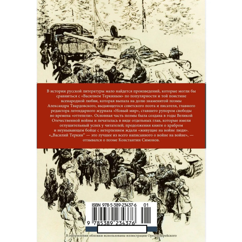 В истории русской литературы мало найдется произведений, которые могли бы сравниться с Василием Теркиным по популярности и той поистине всенародной любви,которая выпала на долю знаменитой поэмы Александра Твардовского, выдающегося советского поэта и писателя, главного редактора легендарного журнала Новый мир, ставшего рупором свободы во времена оттепели. Основная часть поэмы была создана в годы Великой Отечественной войны и печаталась в виде отдельных глав, которые имели оглушительный успех у читателей; продолжения книги о храбром и неунывающем бойце с нетерпением ждали живущие на войне люди. Василий Теркин это лучшее из всего написанного о войне на войне, отзывался о поэме Константин Симонов.