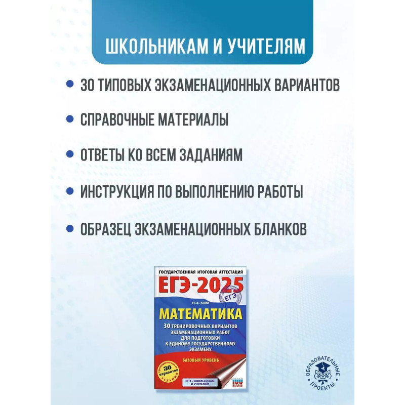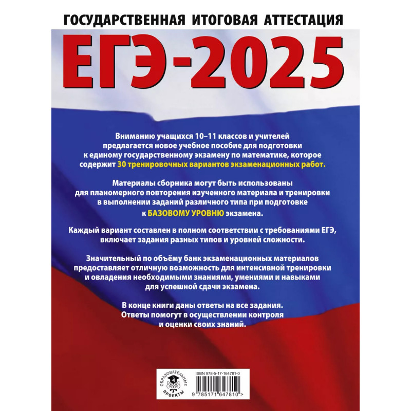 Данное пособие предназначено для учащихся 1011 классов. Оно позволяет в кратчайшие сроки успешно подготовиться к сдаче единого государственного экзамена по математике базового уровня в 2025 году. Пособие содержит 30 тренировочных вариантов. Каждый вариант составлен в полном соответствии с требованиями ЕГЭ, включает задания разных типов и уровней сложности. В конце каждого варианта представлен образец экзаменационного бланка № 1 для записи ответов. Ответы на все задания, размещенные в пособии, помогут в осуществлении контроля и оценки своих знаний.
