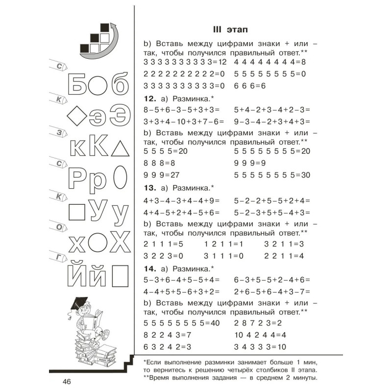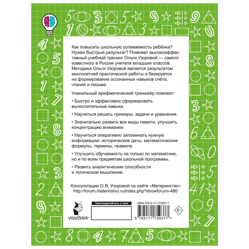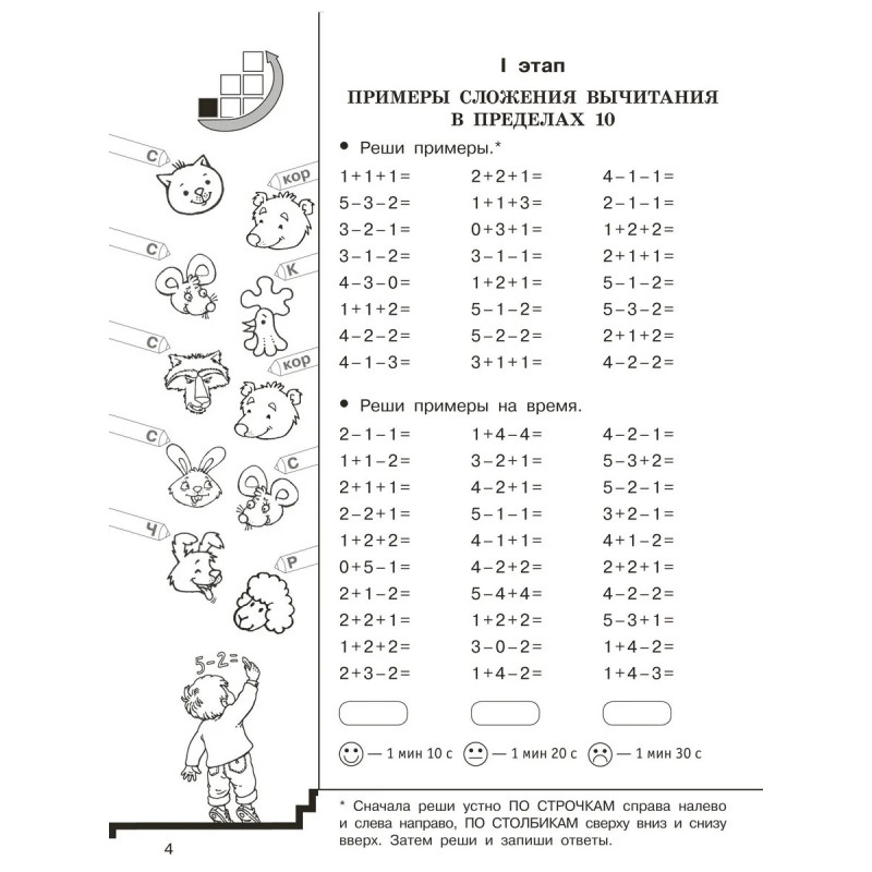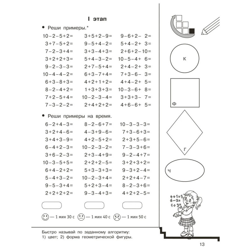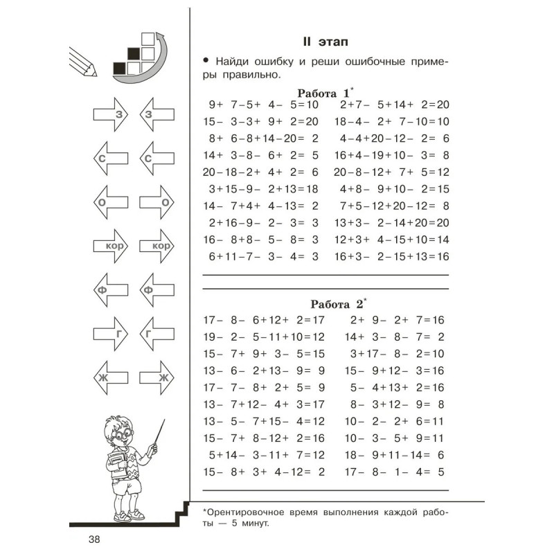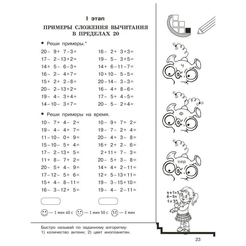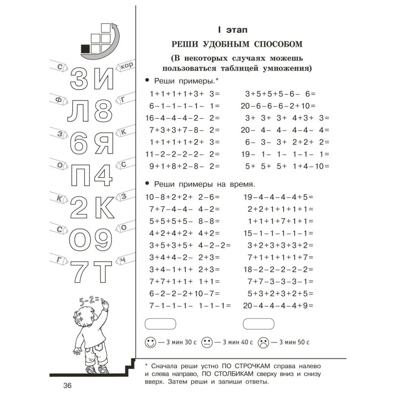 Перед вами сборник упражнений по математике «Цепочки примеров по математике. Счёт в пределах 20. 1-й класс», который разработан известным педагогом-практиком О.В. Узоровой. Пособие будет интересно как преподавателям, так и родителям первоклассников, потому что оно поможет развить вычислительные навыки ребенка и при этом может использоваться при подготовке к урокам, так как соответствует всем федеральным программам начальной школы. Материал в книге строится по принципу «Одна страница книги на каждое занятие». Высокоэффективный учебный тренинг позволит: - за короткий срок активизировать мышление ребёнка, - автоматизировать навыки счёта и закрепить правила выполнения простых математических действий, - оценить достижения первоклассников по математике.