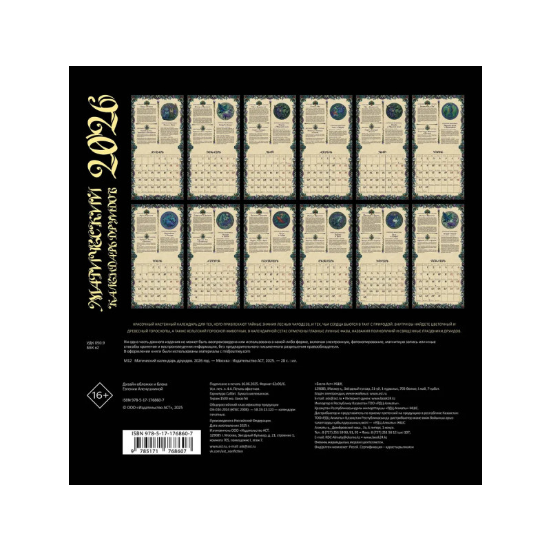 Красочный настенный календарь для тех, кого привлекают тайные знания лесных чародеев, и тех, чьи сердца бьются в такт с природой. Внутри вы найдете цветочный и древесный гороскопы, а также кельтский гороскоп животных. В календарной сетке отмечены главные лунные фазы, названия полнолуний и священные праздники друидов.