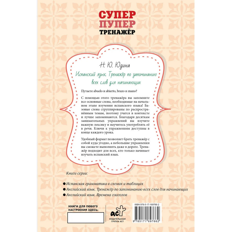 Путаете abuelo и abierto, brazo и mano? С помощью этого тренажера вы запомните все основные слова, необходимые на начальном этапе изучения испанского языка! Базовые слова сгруппированы по распространенным темам, поэтому учатся в контексте и лучше запоминаются. Благодаря десяткам занимательных упражнений вы изучите важную лексику и научитесь употреблять ее в речи. Ключи к упражнениям доступны в конце каждого урока. Удобный формат позволяет брать тренажер с собой куда угодно, а небольшие упражнения вы сможете выполнять даже в дороге. Тренажер подходит для всех, кто только начинает изучать испанский язык.
