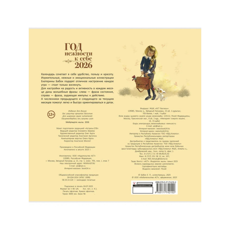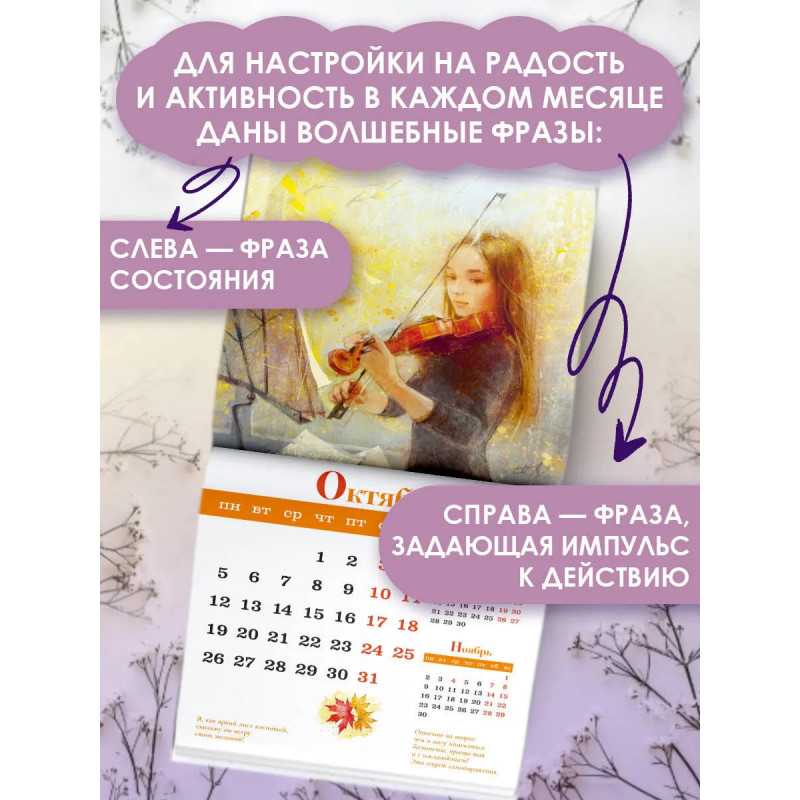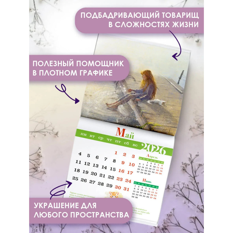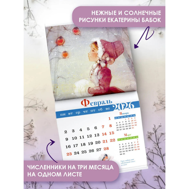 Причины купить Календарь «Год нежности к себе. 2026» — Солнечные, нежные, очаровательные девочки и девушки с рисунков Екатерины Бабок зададут настроение года, месяца, дня. — Настраивающие фразы, помогут собрать интересные, яркие и увлекательные планы на месяц. — Численники на три месяца на одном листе — удобство ориентации в быстротекущем времени. — Календарь «Год нежности к себе» — полезный помощник в плотном графике, подбадривающий товарищ в сложностях жизни и украшение для любого пространства.