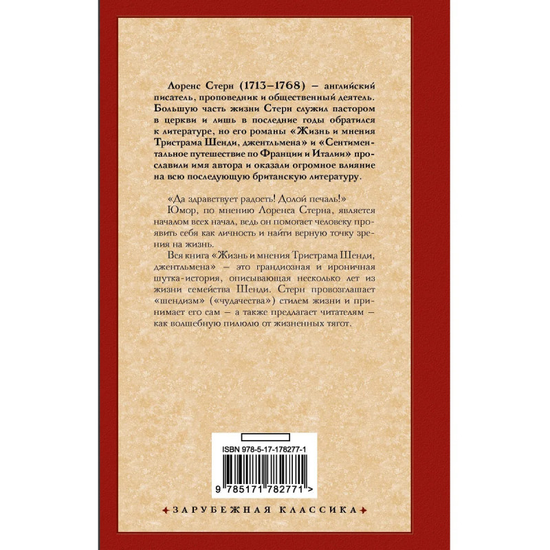 — Одно из главных произведений английской литературы XVIII века. — Лоренс Стерн — английский писатель, священник и проповедник, завоевавший популярность благодаря романам «Жизнь и мнения Тристрама Шенди, джентльмена» и «Сентиментальное путешествие по Франции и Италии». — Задумывавшаяся как пародия на традиционные жизнеописательные романы, «Жизнь и мнения Тристрама Шенди» произвела настоящий фурор экспериментальностью прозы, оригинальностью использованных автором приемов и его многочисленными попытками сломать четвертую стену и вовлечь читателя в происходящее. — Сейчас роман считается одним из ранних предшественников модернистской и даже постмодернистской литературы. — Влияние Лоренса Стерна прослеживается в творчестве таких авторов как Джеймс Джойс, Вирджиния Вульф, Милан Кундера и Томас Пинчон. — Издание в строгом оформлении серии «Зарубежная классика».