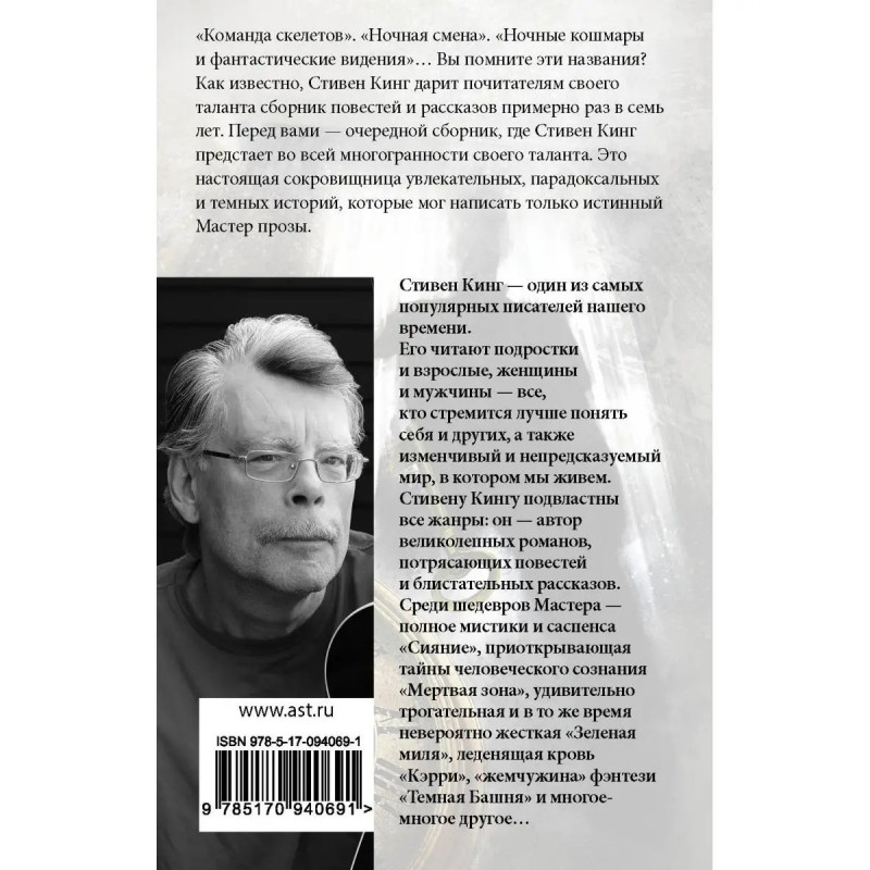 "Команда скелетов". "Ночная смена". "Ночные кошмары и фантастические видения" Вы помните эти названия? Как известно, Стивен Кинг дарит почитателям своего таланта сборник повестей и рассказов примерно раз в семь лет. Перед вами очередной сборник, где Стивен Кинг предстает во всей многогранности своего таланта. Это настоящая сокровищница увлекательных, парадоксальных и темных историй, которые мог написать только истинный Мастер прозы.