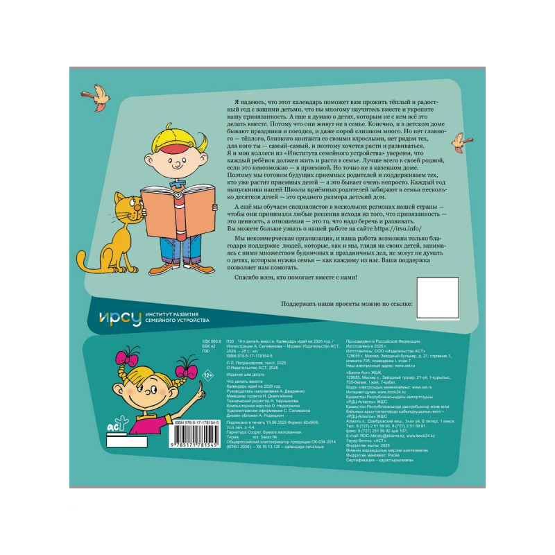 Укрепите семейные отношения: календарь предлагает идеи для совместных занятий, отвлекающих от гаджетов и сближающих вас с детьми. Регулярные совместные активности помогут создать крепкую эмоциональную связь и незабываемые воспоминания. Развивайте и учите в игре: задания календаря развивают креативность, логику и коммуникативные навыки детей и взрослых. Обучение через игру сделает процесс увлекательным и эффективным для всей семьи. Организуйте досуг без хлопот: забудьте о муках выбора — календарь предлагает готовые идеи на каждый месяц, помогая спланировать интересные и полезные совместные мероприятия без лишних усилий.