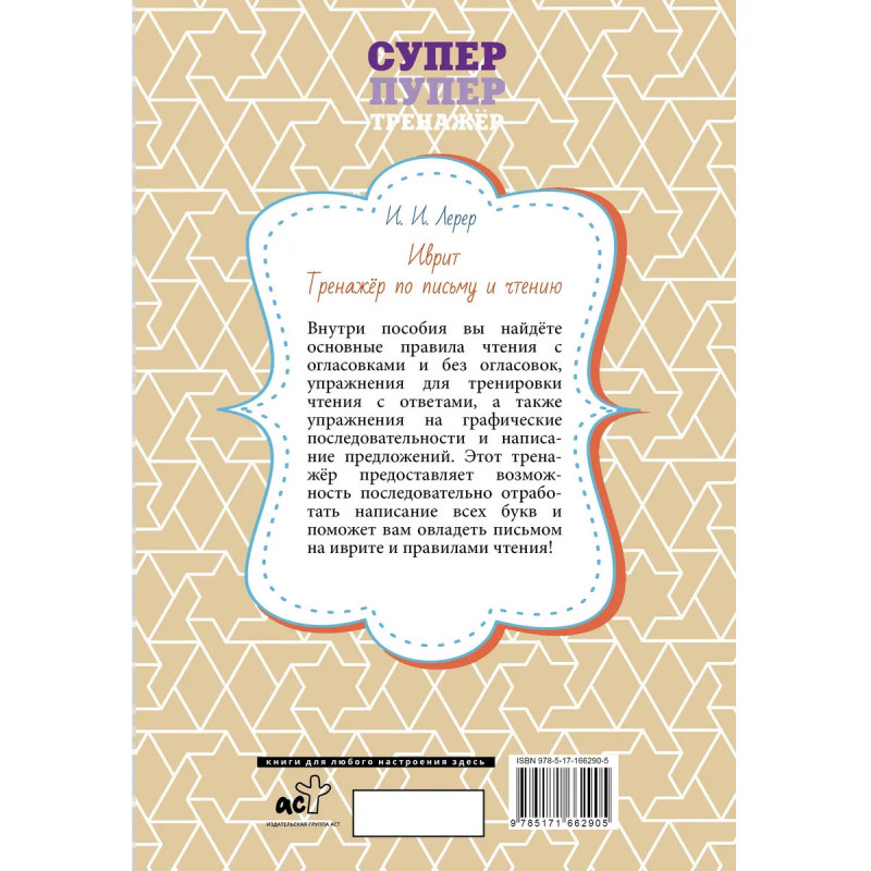 Илья Изевич Лерер – преподаватель иврита с 1991 года. Учился в училище Герцога, в Университете Бар-Илан и в Иерусалимском университете, а также в ИСАА при МГУ, в академии Туро и других учебных заведениях. С 1998 года работает учителем иврита в московской школе № 1540 (школа ОРТ). Автор многих курсов, учебников и пособий по ивриту. Данное пособие поможет начинающим изучать иврит овладеть письмом на иврите и техникой чтения. В пособии рассматриваются алфавит иврита, основные правила чтения с огласовками и без огласовок, приводится сравнение печатных и прописных букв. Чтобы закрепить навыки, даются упражнения для тренировки чтения с ответами, а также упражнения для тренировки написания букв, графических последовательностей и предложений. Тренажёр адресован широкому кругу читателей, изучающих иврит, и поможет в короткие сроки отработать практические навыки чтения и написания букв иврита.