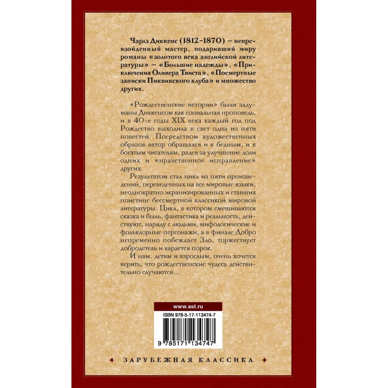 Рождественские истории. "Рождественские истории" были задуманы Диккенсом как социальная проповедь, и в 4-е годы XIX века каждый год под Рождество выходила в свет одна из пяти повестей. Посредством художественных образов автор обращался и к бедным, и к богатым читателям, радея за улучшение доли одних и "нравственное исправление" других. Результатом стал цикл из пяти произведений, переведенных на все мировые языки, неоднократно экранизированных и ставших поистине бессмертной классикой мировой литературы. Цикл, в котором смешиваются сказка и быль, фантастика и реальность, действуют, наряду с людьми, мифологические и фольклорные персонажи, а в финале Добро непременно побеждает Зло, торжествует добродетель и карается порок. И нам, детям и взрослым, очень хочется верить, что рождественские чудеса действительно случаются