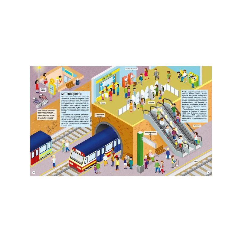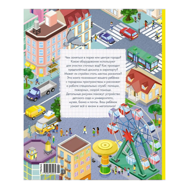 Чем заняться в парке или центре города? Какое оборудование используют для очистки сточных вод? Как проходит предполётный досмотр в аэропорту? Может ли стройка стать местом раскопок? Эта книга познакомит вашего ребёнка с городским пространством и расскажет о работе специальных служб: полиции, пожарных, скорой помощи. Детальные рисунки покажут устройство детского сада и университета, музея, банка и почты. Ваш ребёнок узнает всё о жизни в мегаполисе!