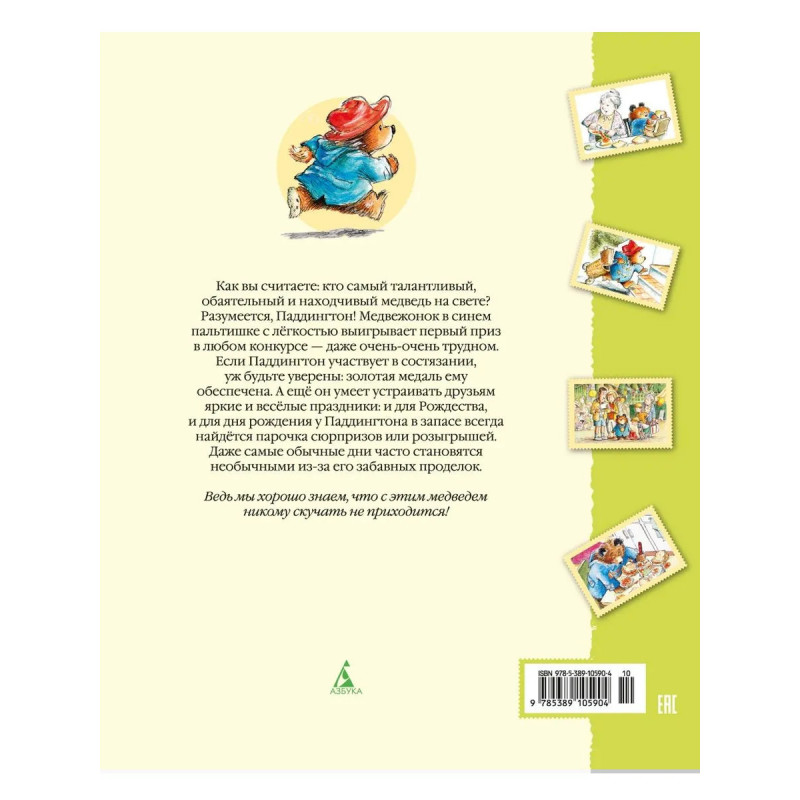 Как вы считаете: кто самый талантливый, обаятельный и находчивый медведь на свете? Разумеется, Паддингтон! Медвежонок в синем пальтишке с лёгкостью выигрывает первый приз в любом конкурсе — даже очень-очень трудном. Если Паддингтон участвует в состязании, уж будьте уверены: золотая медаль ему обеспечена. А ещё он умеет устраивать друзьям яркие и весёлые праздники: и для Рождества и для дня рождения у Паддингтона в запасе всегда найдётся парочка сюрпризов или розыгрышей. Даже самые обычные дни часто становятся необычными из-за его забавных проделок — ведь мы хорошо знаем, что с этим медведем никому скучать не приходится!