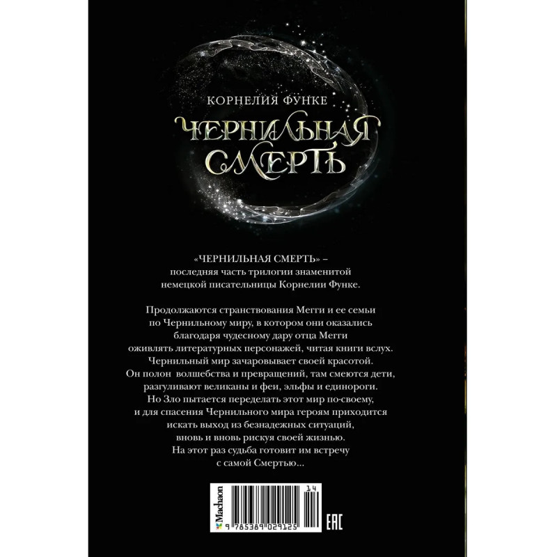 «ЧЕРНИЛЬНАЯ СМЕРТЬ» – последняя часть трилогии знаменитой немецкой писательницы Корнелии Функе. Продолжаются странствования Мегги и ее семьи по Чернильному миру, в котором они оказались благодаря чудесному дару отца Мегги оживлять литературных персонажей, читая книги вслух. Чернильный мир зачаровывает своей красотой. Он полон волшебства и превращений, там смеются дети, разгуливают великаны и феи, эльфы и единороги. Но Зло пытается переделать этот мир по-своему, и для спасения Чернильного мира героям приходится искать выход из безнадежных ситуаций, вновь и вновь рискуя своей жизнью. На этот раз судьба готовит им встречу с самой Смертью…