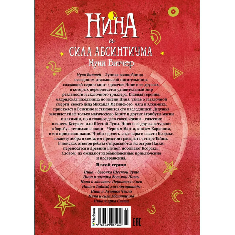 Муни Витчер – Лунная волшебница – псевдоним итальянской писательницы, создавшей серию книг о девочке Нине и ее друзьях, в которых переплетается удивительный мир реальности и сказочного триллера. Главная героиня, мадридская школьница по имени Нина, узнав о загадочной смерти своего деда Михаила Мезинского, мага и алхимика, приезжает в Венецию и становится его наследницей. Дедушка завещает ей не только магическую Книгу и другие атрибуты магии и алхимии, но и главное дело своей жизни – спасение планеты Ксоракс, или Шестой Луны. Нина и ее друзья вступают в борьбу с темными силами – Черным Магом, князем Карконом, и его приспешниками. Чтобы одолеть злые чары и спасти Ксоракс, планету добра и света, им предстоит раскрыть четыре Тайны. В поисках ответов ребята отправляются на остров Пасхи, переносятся в Древний Египет, посещают Ксоракс… Словом, их ожидают необыкновенные приключения и превращения.