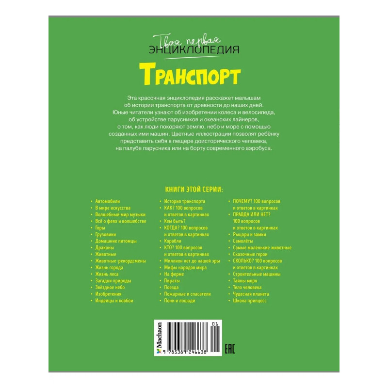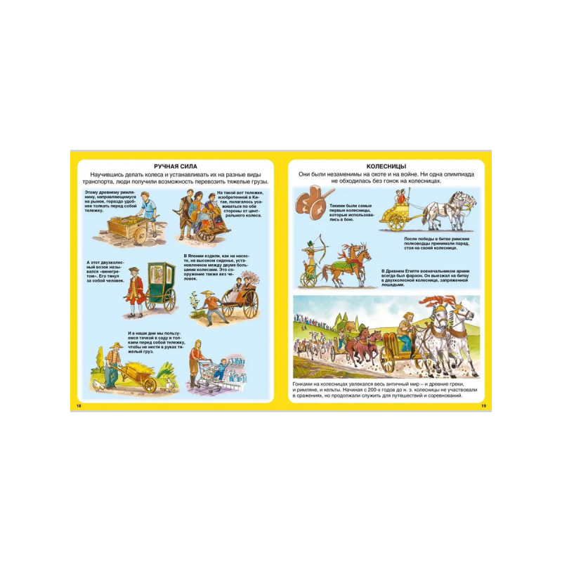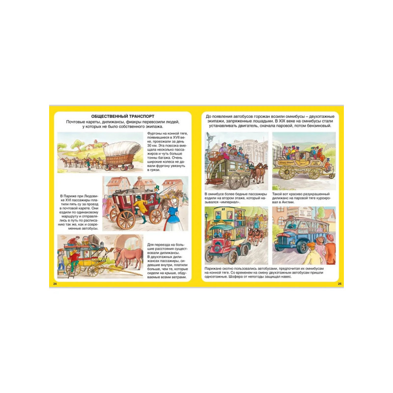 Эта красочная энциклопедия расскажет малышам об истории транспорта от древности до наших дней. Юные читатели узнают об изобретении колеса и велосипеда, об устройстве парусников и океанских лайнеров, о том, как люди покоряют землю, небо и море с помощью созданных ими машин. Цветные иллюстрации позволят ребёнку представить себя в пещере доисторического человека, на палубе парусника или на борту современного аэробуса.