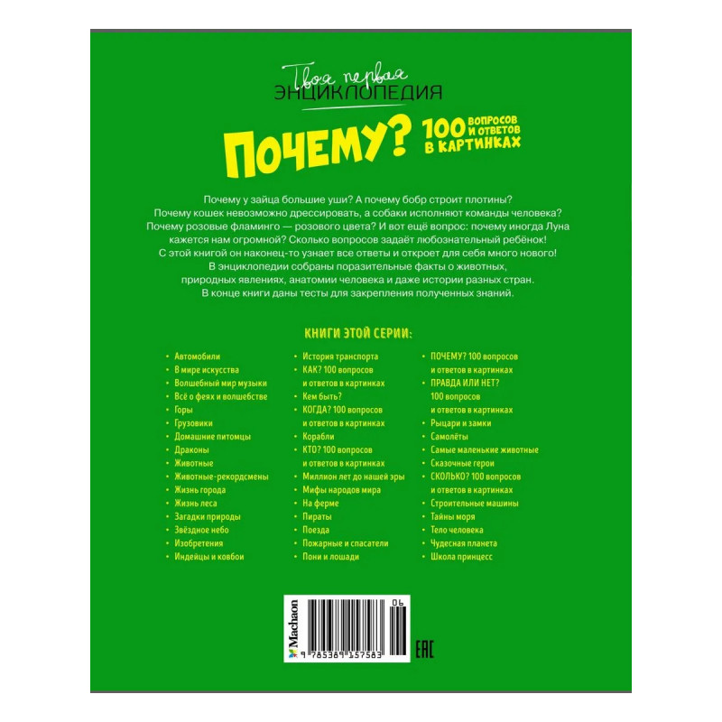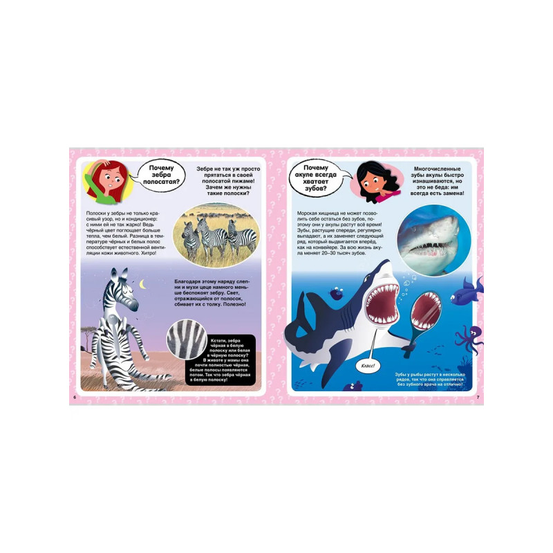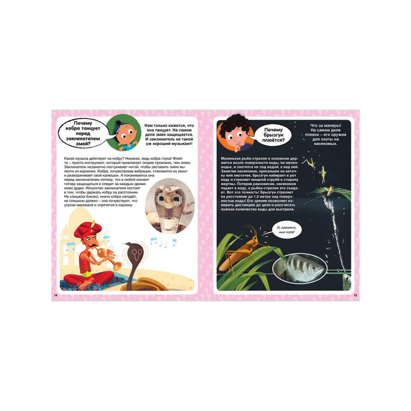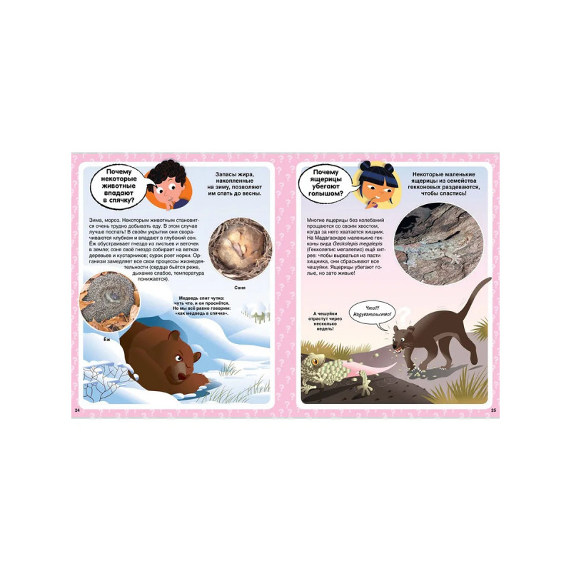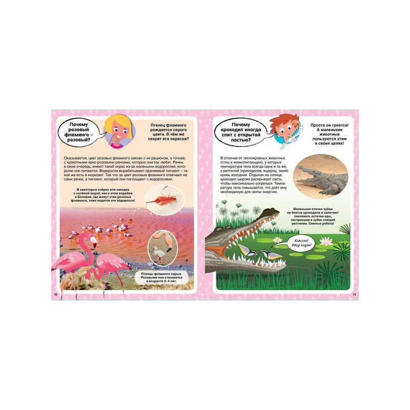 Почему у зайца большие уши? А почему бобр строит плотины? Почему кошек невозможно дрессировать, а собаки исполняют команды человека? Почему розовые фламинго — розового цвета? И вот ещё вопрос: почему иногда Луна кажется нам огромной? Сколько вопросов задаёт любознательный ребёнок! С этой книгой он наконец-то узнает все ответы и откроет для себя много нового! В энциклопедии собраны поразительные факты о животных, природных явлениях, анатомии человека и даже истории разных стран. В конце книги даны тесты для закрепления полученных знаний.