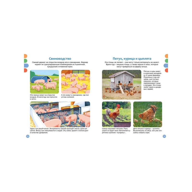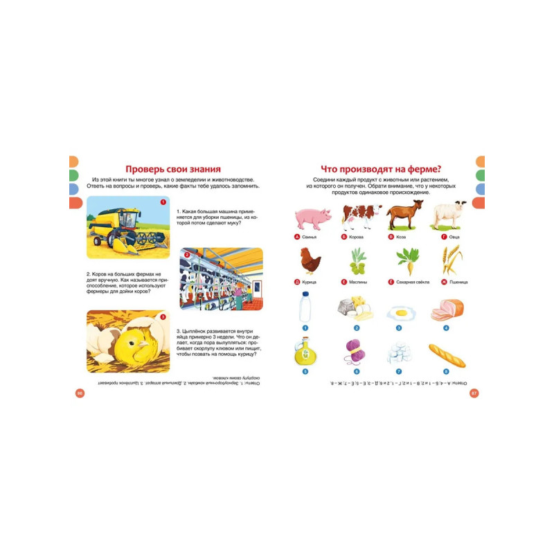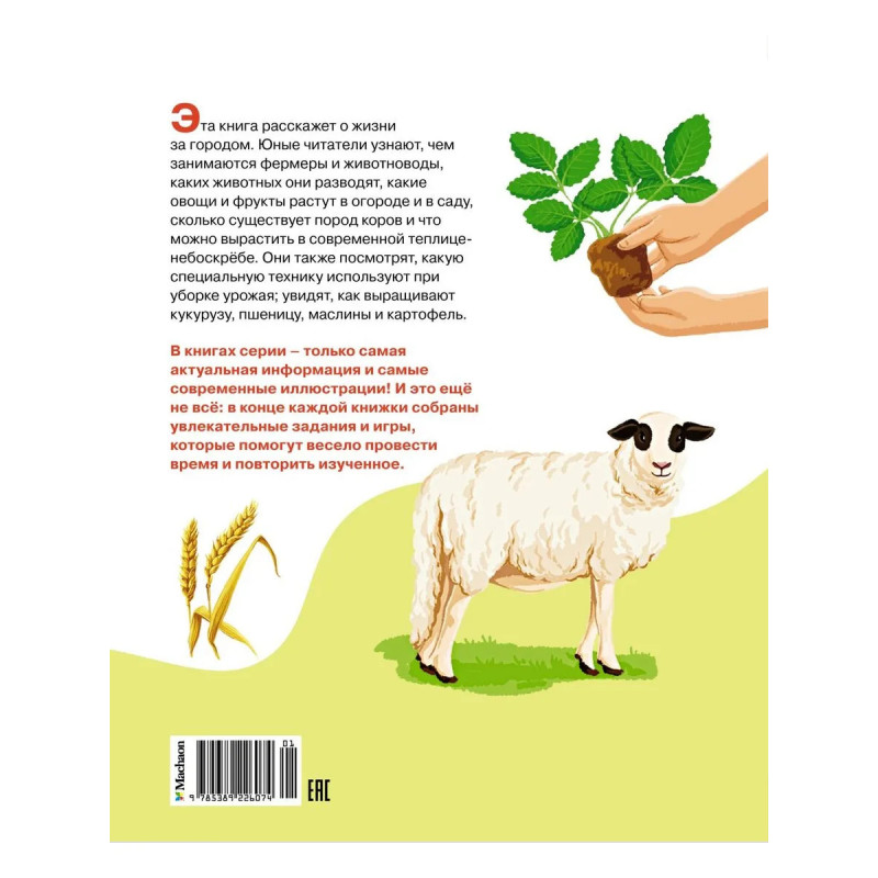 Эта книга расскажет о жизни за городом. Юные читатели узнают, чем занимаются фермеры и животноводы, каких животных они разводят, какие овощи и фрукты растут в огороде и в саду, сколько существует пород коров и что можно вырастить в современной теплице- небоскрёбе. Они также посмотрят, какую специальную технику используют при уборке урожая; увидят, как выращивают кукурузу, пшеницу, маслины и картофель. В книгах серии – только самая актуальная информация и самые современные иллюстрации! И это ещё не всё: в конце каждой книжки собраны увлекательные задания и игры, которые помогут весело провести время и повторить изученное.