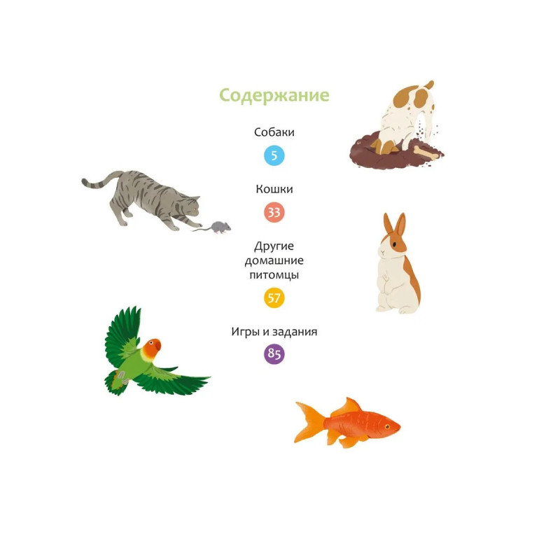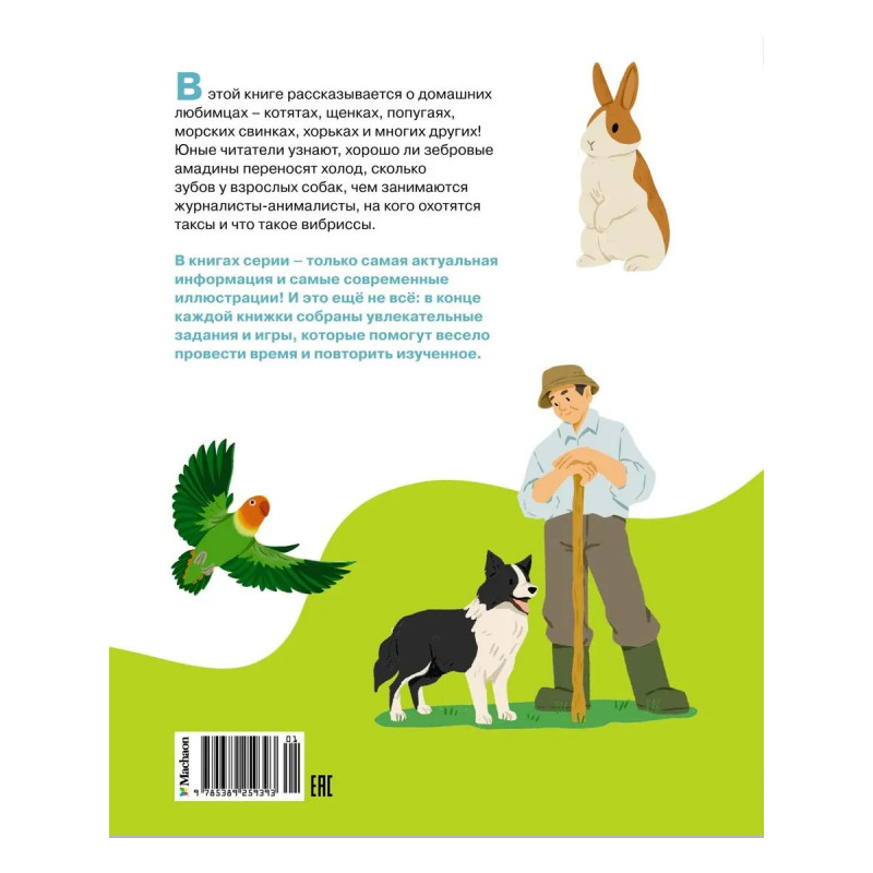 В этой книге рассказывается о домашних любимцах – котятах, щенках, попугаях, морских свинках, хорьках и многих других! Юные читатели узнают, хорошо ли зебровые амадины переносят холод, сколько зубов у взрослых собак, чем занимаются журналисты-анималисты, на кого охотятся таксы и что такое вибриссы. В книгах серии – только самая актуальная информация и самые современные иллюстрации! И это ещё не всё: в конце каждой книжки собраны увлекательные задания и игры, которые помогут весело провести время и повторить изученное.