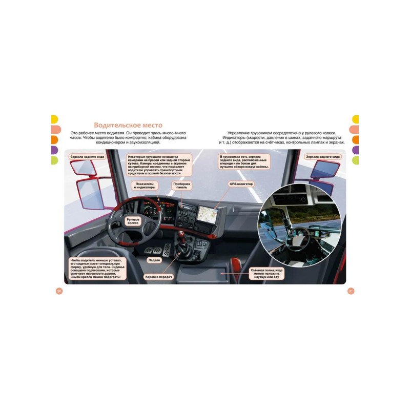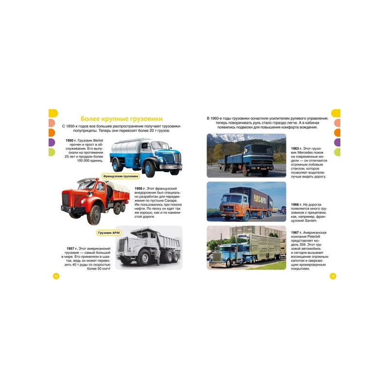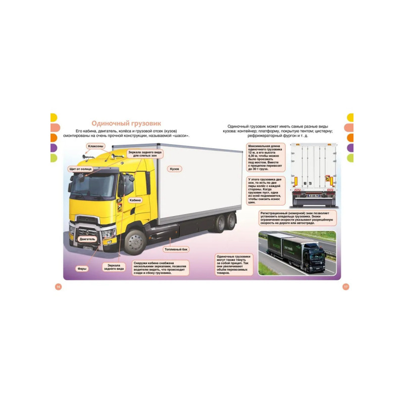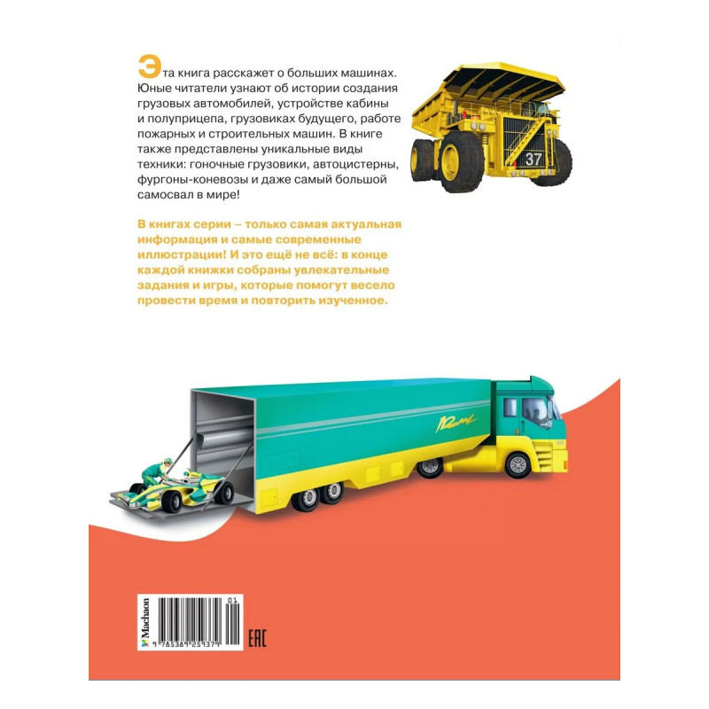 Эта книга расскажет о больших машинах.Юные читатели узнают об истории создания грузовых автомобилей, устройстве кабины полуприцепа, грузовиках будущего, работе пожарных и строительных машин. В книге также представлены уникальные виды техники: гоночные грузовики, автоцистерны, фургоны-коневозы и даже самый большой самосвал в мире!