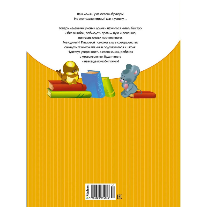 Теперь маленький ученик должен научиться читать быстро и без ошибок, соблюдать правильную интонацию, понимать смысл прочитанного. Методика Н. Павловой поможет ему в совершенстве овладеть техникой чтения и подготовиться к школе. Чувствуя уверенность в своих силах, ребёнок с удовольствием будет читать и навсегда полюбит книги!
