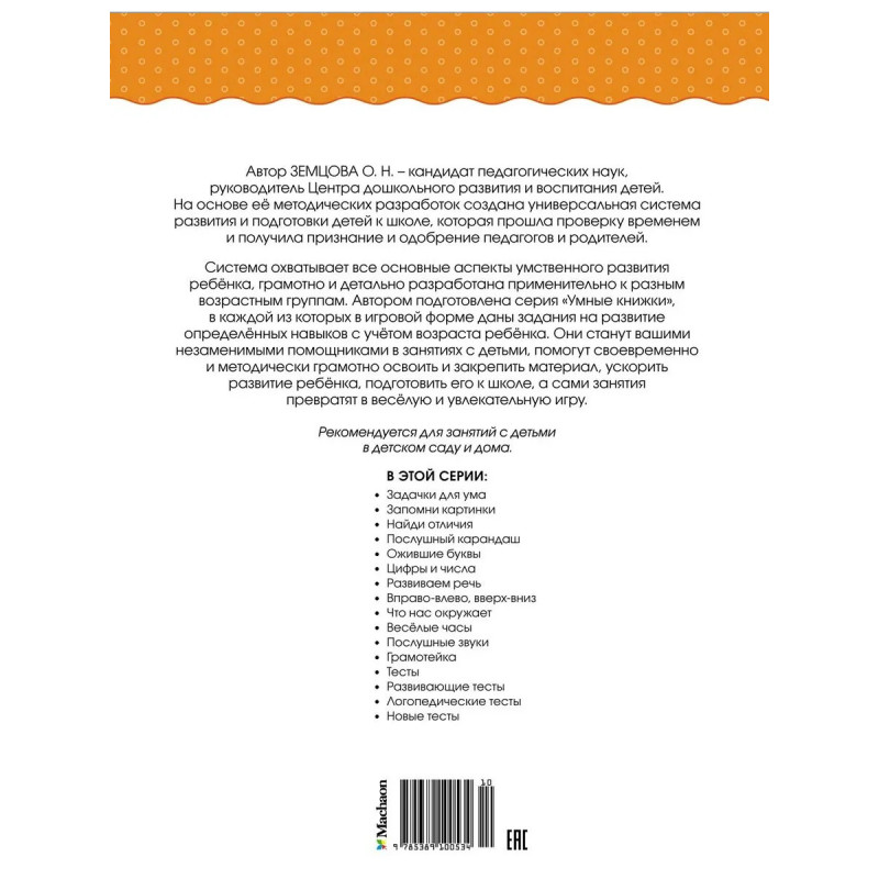 Система охватывает все основные аспекты умственного развития ребёнка, грамотно и детально разработана применительно к разным возрастным группам. Автором подготовлена серия «Умные книжки», в каждой из которых в игровой форме даны задания на развитие определённых навыков с учётом возраста ребёнка. Они станут вашими незаменимыми помощниками в занятиях с детьми, помогут своевременно и методически грамотно освоить и закрепить материал, ускорить развитие ребёнка, подготовить его к школе, а сами занятия превратят в весёлую и увлекательную игру.