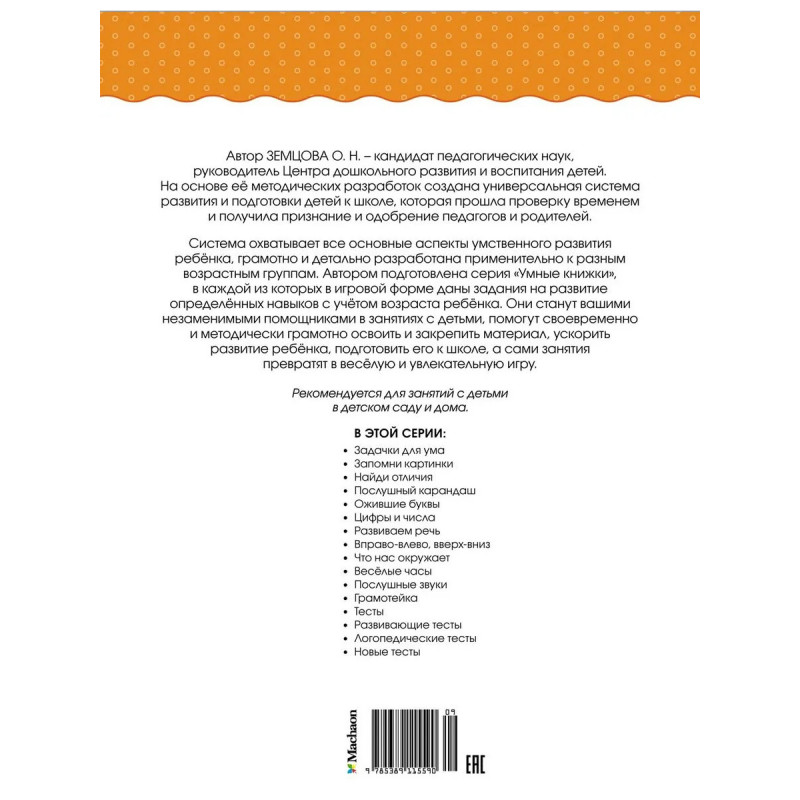 Система охватывает все основные аспекты умственного развития ребёнка, грамотно и детально разработана применительно к разным возрастным группам. Автором подготовлена серия «Умные книжки», в каждой из которых в игровой форме даны задания на развитие определённых навыков с учётом возраста ребёнка. Они станут вашими незаменимыми помощниками в занятиях с детьми, помогут своевременно и методически грамотно освоить и закрепить материал, ускорить развитие ребёнка, подготовить его к школе, а сами занятия превратят в весёлую и увлекательную игру.