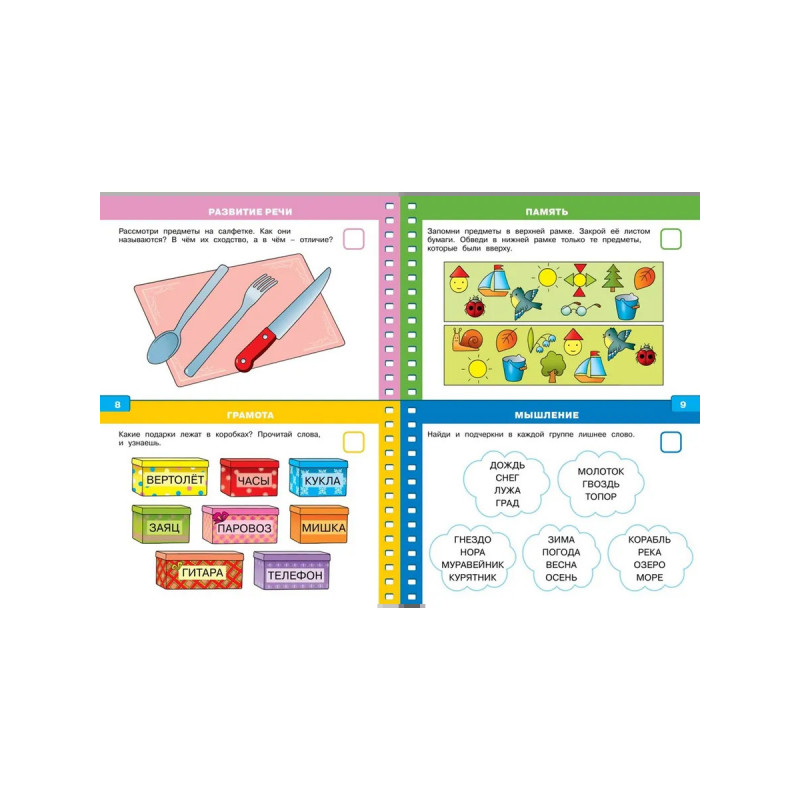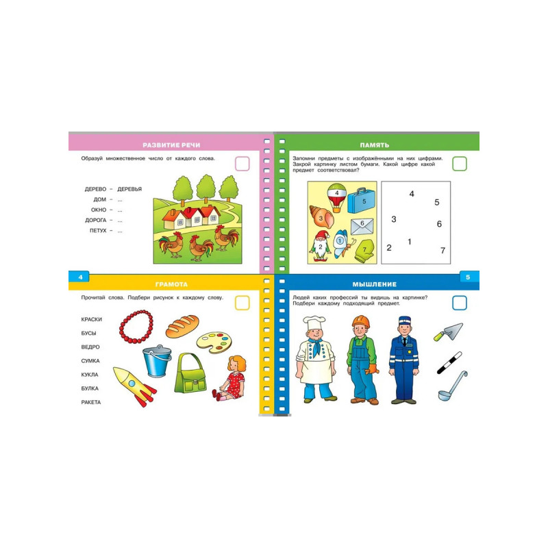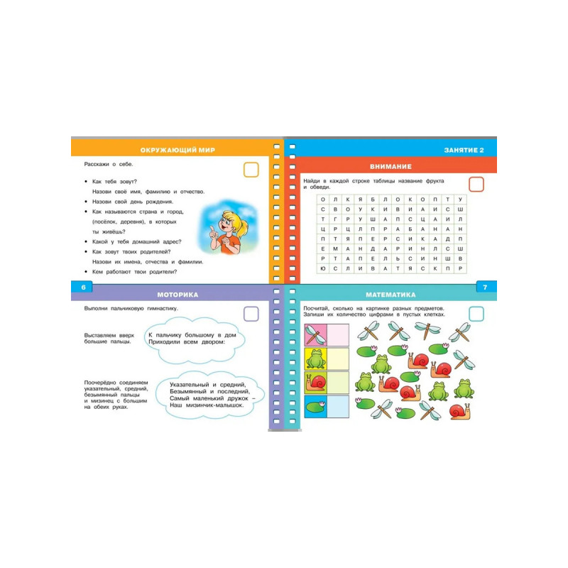 Задания в книгах «Тесты» составлены по разделам: мышление, грамота, развитие речи, математика, окружающий мир, моторика, сенсорика, внимание, память. Ребёнок ответит на вопросы по различным темам, научится размышлять и решать логические задачки, познакомится с основами чтения и счёта и подготовит руку к письму. В конце книги вы сможете подвести итог, подсчитав количест
