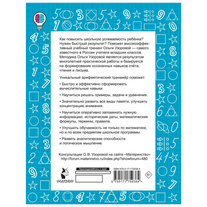 Перед вами сборник упражнений по математике «Цепочки примеров по математике. Счёт в пределах 100. 2-й класс», который разработан известным педагогом-практиком О.В. Узоровой. Пособие будет интересно как преподавателям, так и родителям второклассников, потому что оно поможет ученику ускорить свои вычислительные навыки и при этом может использоваться при подготовке к урокам, так как соответствует всем федеральным программам начальной школы. Высокоэффективный учебный тренинг позволит: - за короткий срок закрепить правила выполнения простых математических действий, - значительно развить концентрацию внимания и все виды памяти, - оценить достижения юного ученика по математике.