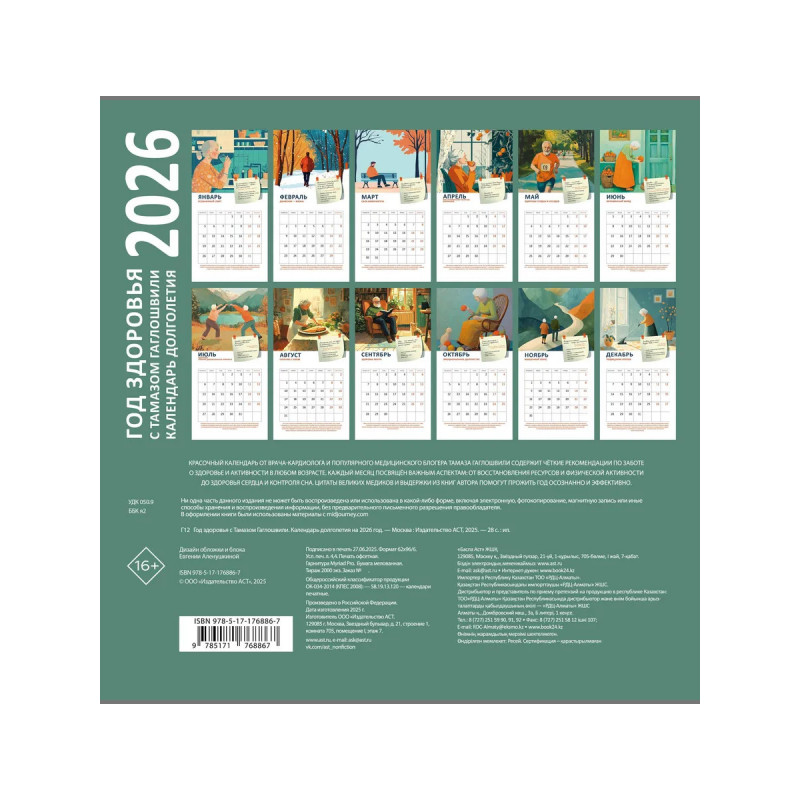 Начните свой год с осознанных шагов навстречу здоровью! Настенный календарь от врача-кардиолога, геронтолога и популярного медицинского блогера Тамаза Гаглошвили поможет вам эффективно заботиться о своем организме и оставаться активным в любом возрасте. Каждый месяц в календаре посвящён ключевой теме: от восстановления ресурсов организма и физической активности до поддержания сердечно-сосудистой системы и контроля за сном. К каждому месяцу вы найдете чёткие рекомендации, а также цитаты великих медиков и выдержки из книг автора. Это не просто календарь — это ваш путь к более осознанному образу жизни и долгим активным годам!