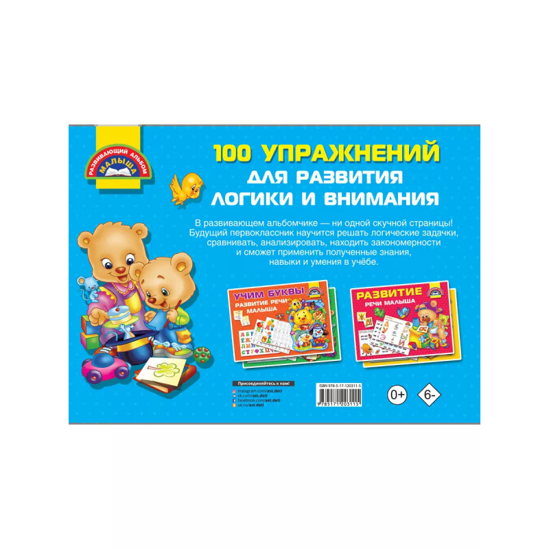 100 упражнений для развития логики и внимания. О чем эта книга Красочный альбом по развитию логики и внимания позволит в игровой форме научить дошкольников рационально и логически мыслить, подмечать детали, анализировать и структурировать информацию, проявить интеллектуальные и творческие способности. Кому эта книга будет интересна Книга адресована родителям, педагогам дополнительного образования, гувернерам для занятий с детьми дошкольного возраста. Каковы особенности этой книги " Игры в картинках - отличный способ в легкой, увлекательной форме потренировать логику и внимание. " Интеллектуальные занятия расширяют кругозор и словарный запас, формируют познавательные навыки, развивают гибкость ума, наблюдательность и смекалку. " Разнообразные логические задания - всё, что нужно для развития интеллектуальных и личностных качеств ребенка. " Удобный формат позволяет брать книжку и в гости, и в поездку, и на прогулку. " Важный бонус - те положительные эмоции, которые испытывают и малыши, и взрослые во время решения логических задачек. Красочный развивающий аль
