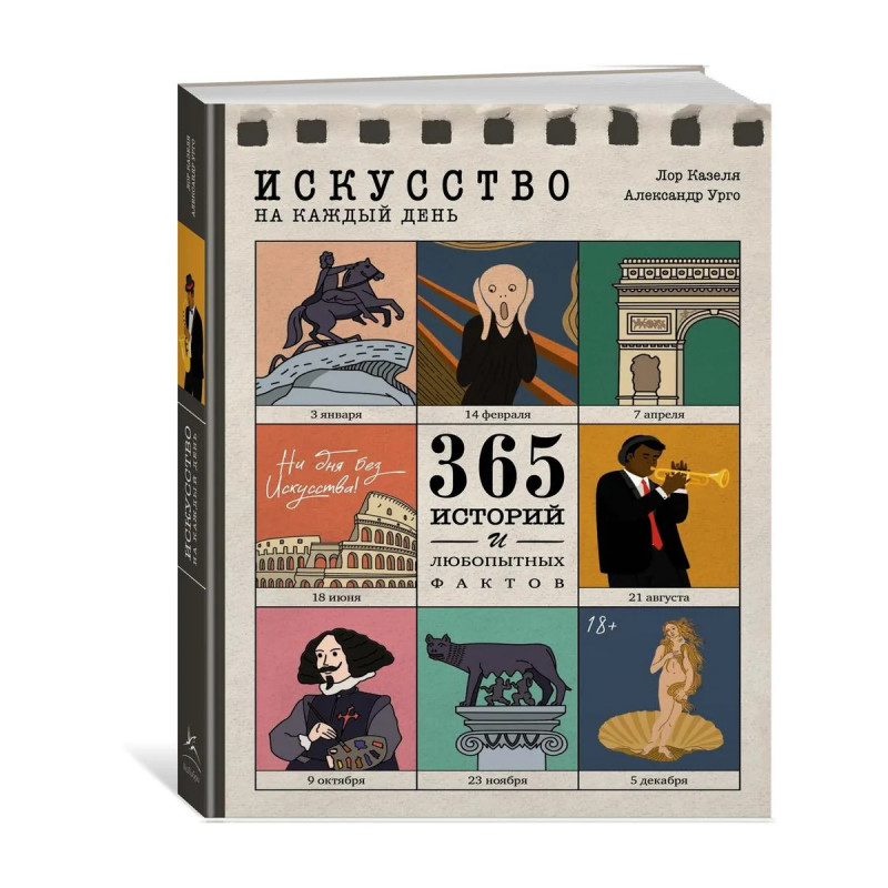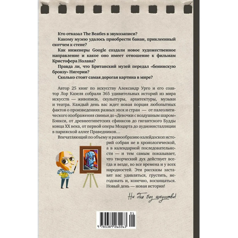 Автор 25-ти книг по искусству Александр Урго и его соавтор Лор Казеля рассказали 365 увлекательных историй об изобразительном искусстве, архитектуре, музыке, танце и театре. Представив их не в хронологической, а в календарной последовательности, они показали, что творческий дух действует всегда и везде, во все времена и у всех народов. Впечатляющий по объему и разнообразию калейдоскоп историй об искусстве — от наскальных росписей до уличных граффити и от египетских сфинксов до парижских аудио-инсталляций — заставит вас удивляться, грустить, даже негодовать и, конечно, восхищаться.
