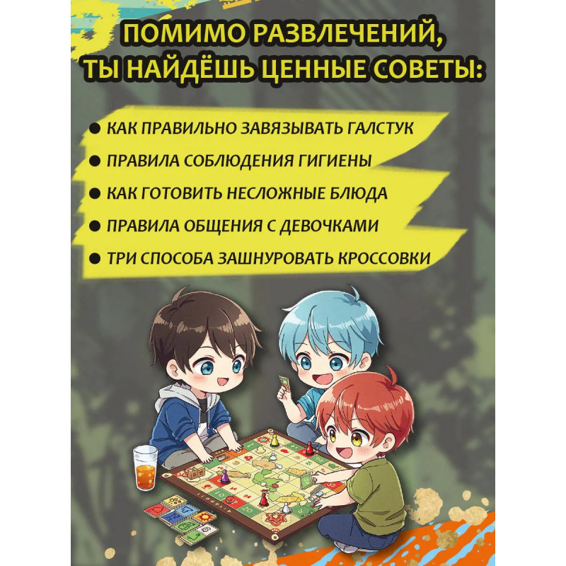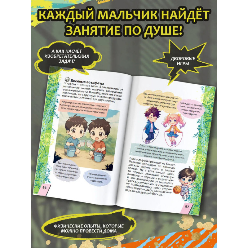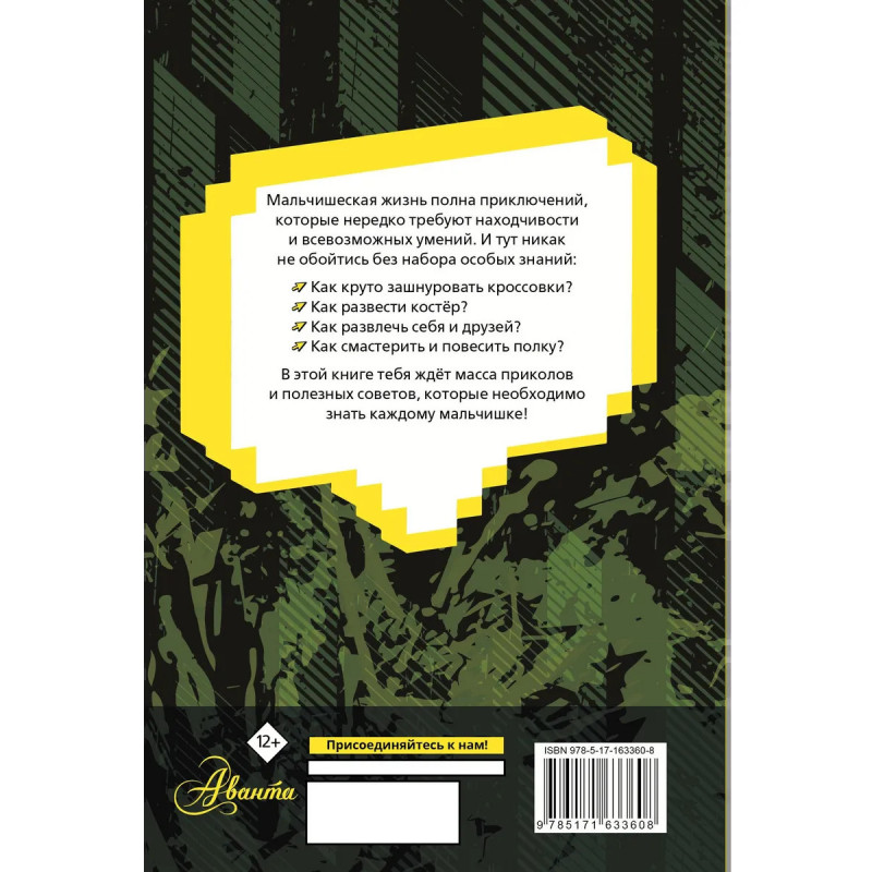 Эта книга — отличный спутник любого мальчишки в его бесконечных приключениях! Тебя ждёт множество идей для весёлого времяпровождения — как наедине с собой, так и в компании друзей. Ведь что может быть интереснее дворовых игр? Или физических опытов, которые можно провести дома? А как насчёт изобретательских задач? Помимо всевозможных приколов, ты найдёшь здесь массу полез- ных советов. Узнаешь, что взять с собой в поход; как приготовить несложное, но вкусное блюдо; а в конце найдёшь тесты, которые могут помочь определиться с будущей профессией. Для среднего школьного возраста.