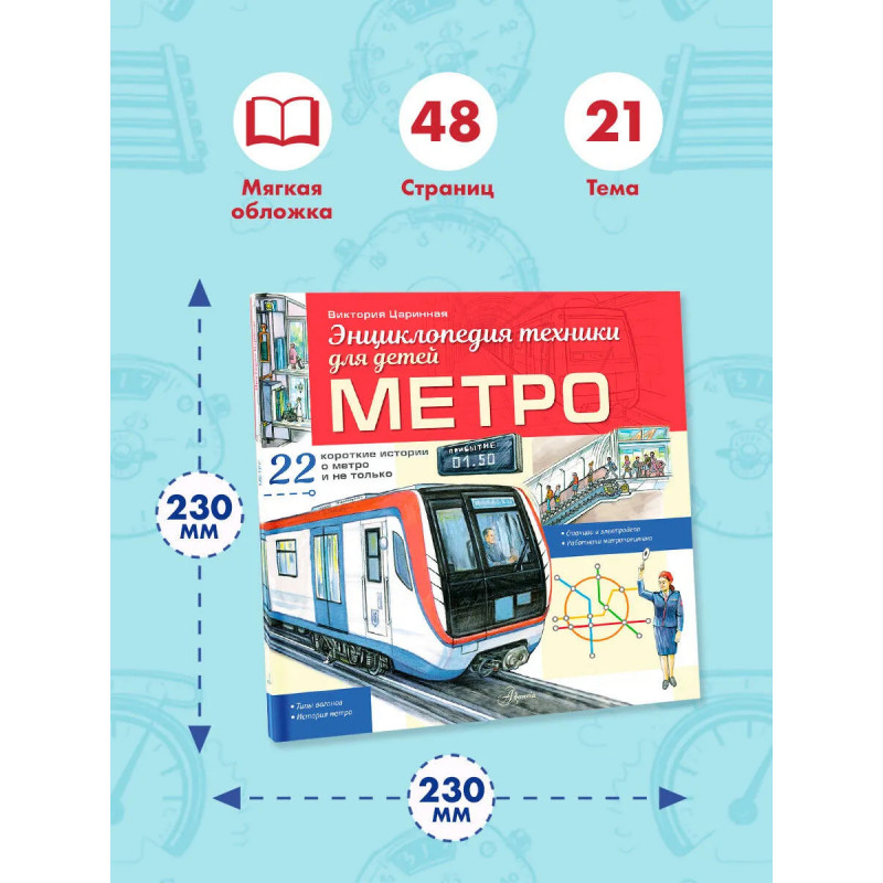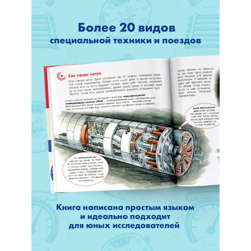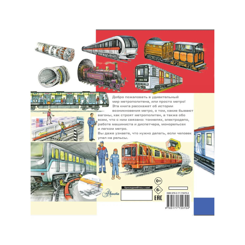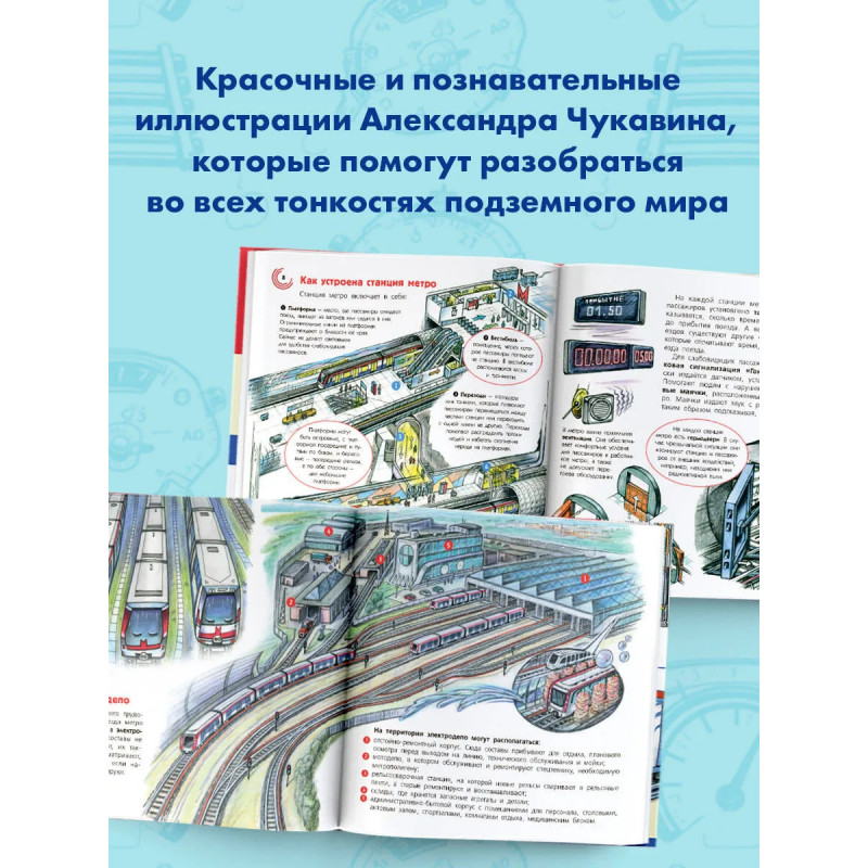 Вы готовы отправиться в увлекательное путешествие в мир подземных поездов? Эта энциклопедия расскажет всё о метро: его историю от самых первых линий до современных монорельсов, устройство станций-дворцов и электродепо, где "отдыхают" составы. Вы узнаете, как устроены эскалаторы и лифты, кто управляет движением поездов и как строятся тоннели под землёй и над землёй! А ещё познакомитесь с разными профессиями метрополитена – от машиниста до диспетчера. Книгу украшают красочные и познавательные иллюстрации Александра Чукавина, которые помогут разобраться во всех тонкостях подземного мира! Для младшего школьного возраста.