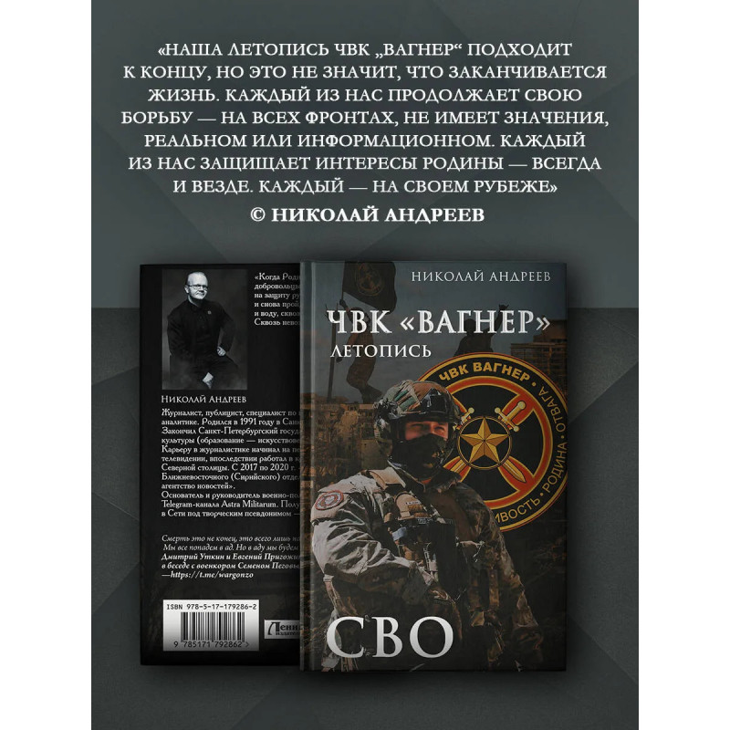 В 2022 году Россия объявила о начале специальной военной операции (СВО) по демилитаризации и денацификации Украины. Возникновение экзистенциальной угрозы на западных границах России потребовалоконсолидации всех усилий по защите русскоязычного населения Донбасса от украинской агрессии. В этих условиях начиная с марта 2022 года в зоне боевых действий в ДНР и ЛНР действует — сперва инкогнито, затем при широкой поддержке общественности — частное добровольческое подразделение ЧВК "Вагнер", которое сумело переломить весь ход СВО и нанести сокрушительное поражение украинским силовикам. Автор книги, журналист и публицист, автор канала Astra Militarum Николай Андреев (известный в Сети под псевдонимом Комиссар Яррик) на протяжении последних лет внимательно следил за подвигами русских добровольцев. В заключительной книге цикла "ЧВК „Вагнер“. Летопись" рассказывается об участии российских военных специалистов в боевых действиях в рамках СВО, освобождении Попасной, Соледара и Артемовска (Бахмута).