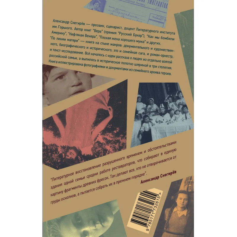 – Новинка от АлександраСнегирёва — книга на стыке жанров, семейная сага, основанная на письменных и устных свидетельствах, мемуарах и старых фотографиях. По словам автора, это «литературное восстановление разрушенного временем и обстоятельствами здания одной российской семьи». – Композиция романа трехчастная: первая — авторское повествование Снегирёва, история семьи и ее отдельных представителей; вторая и третья — «живые голоса» героев: расшифровка интервью КсенииРунич и воспоминания‑записи ФёдораТерехова. – АлександрСнегирёв — известный писатель и сценарист, автор книг «Плохая жена хорошего мужа», «Как мы бомбили Америку», «НефтянаяВенера», «Вера», лауреат литературных премий.