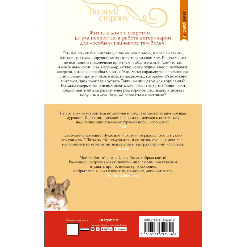 – Продолжение истории о ветеринаре Татьяне, которая помогает самым необычным животным. Теплая и светлая сказка для взрослых — о дружбе, любви и том, как забота близких порой исцеляет лучше любых лекарств. – Многие читатели на ЛитРесе отмечают, что книги Ольги Назаровой поддержали их в сложные периоды жизни. – Подойдет тем, кто любит добрую, человечную прозу в духе Наринэ Абгарян, Славы Сэ и Максима Малявина. – Серия «Будьте добры: роман-антидепрессант» — теплые истории для поднятия настроения в трудный момент.