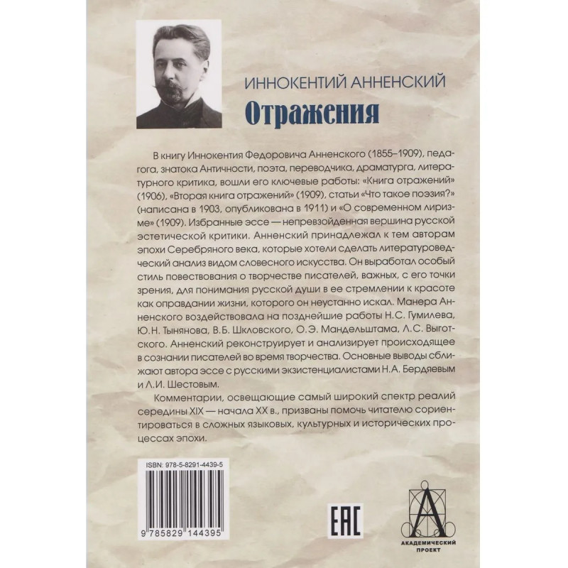 В книгу Иннокентия Федоровича Анненского (1855-1909), педагога, знатока Античности. поэта, переводчика, драматурга, литературного критика, вошли его ключевые работы: «Книга отражений» (1906), «Вторая книга отражений» (1909), статьи «Что такое поэзия?» (написана в 1903. опубликована в 1911) и «О современном лиризме» (1909). Избранные эссе — непревзойденная вершина русской эстетической критики. Анненский принадлежал к тем авторам эпохи Серебряного века, которые хотели сделать литературоведческий анализ видом словесного искусства. Он выработал особый стиль повествования о творчестве писателей, важных, с его точки зрения, для понимания русской души в ее стремлении к красоте как оправдании жизни, которого он неустанно искал. Манера Анненского воздействовала на позднейшие работы Н.С. Гумилева. Ю.И. Тынянова, В.Б. Шкловского, О.Э. Мандельштама, Л.С. Выготского. Анненский реконструирует и анализирует происходящее в сознании писателей во время творчества. Основные выводы сближают автора эссе с русскими экзистенциалист